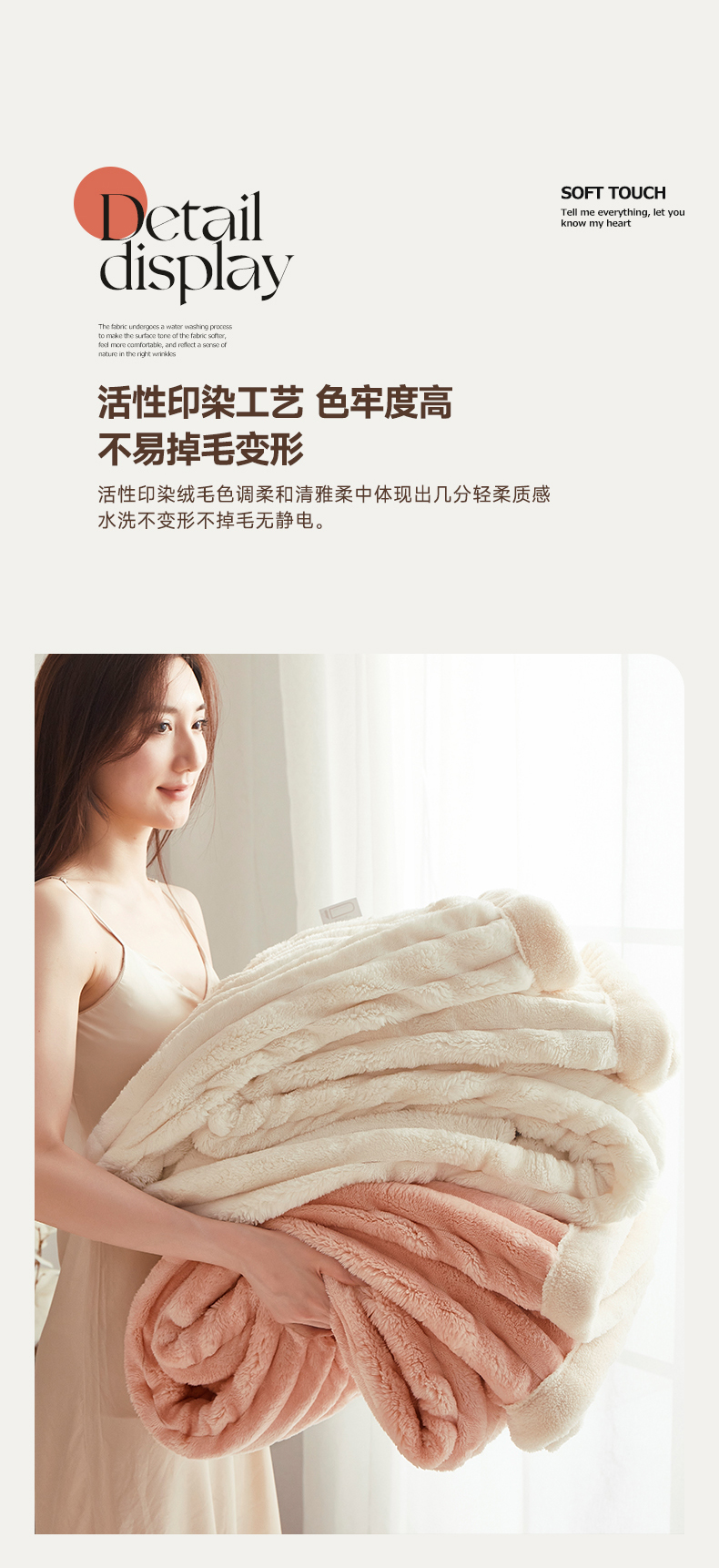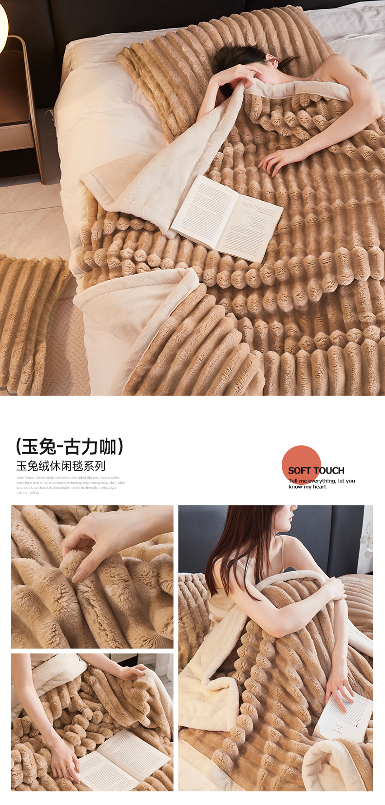 商品名称:悦织湾家纺 2025新款A面兔毛绒B面北极绒抽条毛毯610每平方克重玉兔绒双层加厚保暖休闲盖毯 外贸跨境电商 玉兔-古力咖