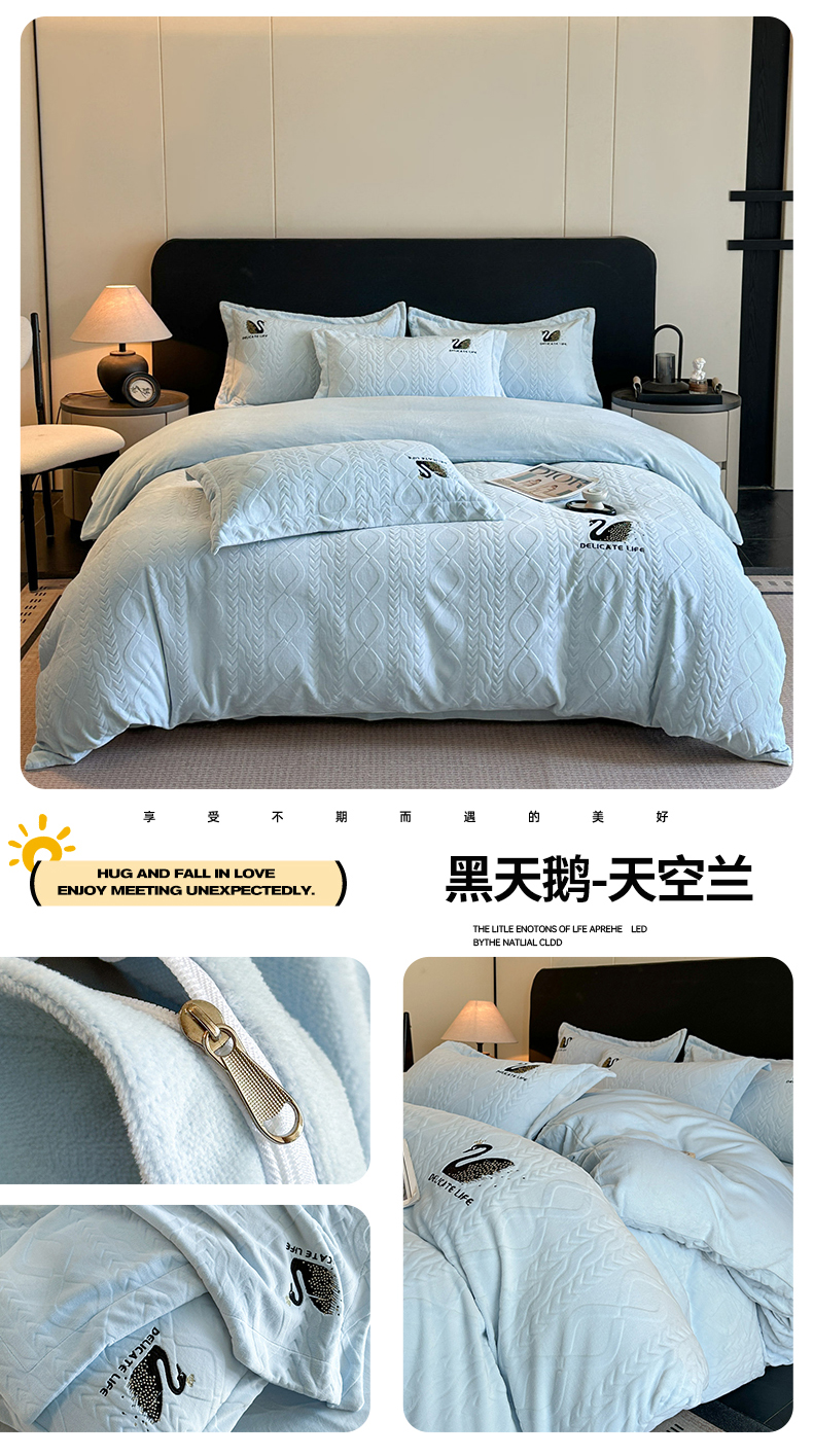 当前位置: 91家纺网 > 商品网购 > 床品套件 > 四件套 > 牛奶绒四件套 > 爱家(原缔乐家纺) 2025新款A类牛奶雕花绒四件套 保罗-黑天鹅系列 保罗-高雅灰