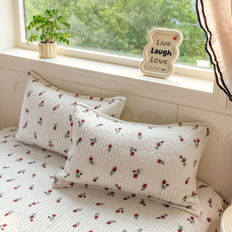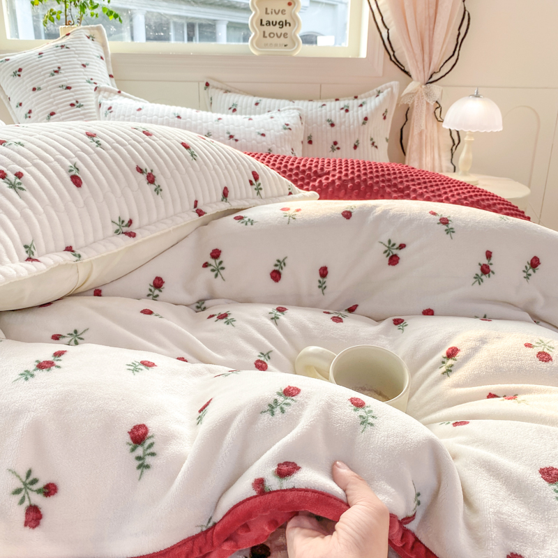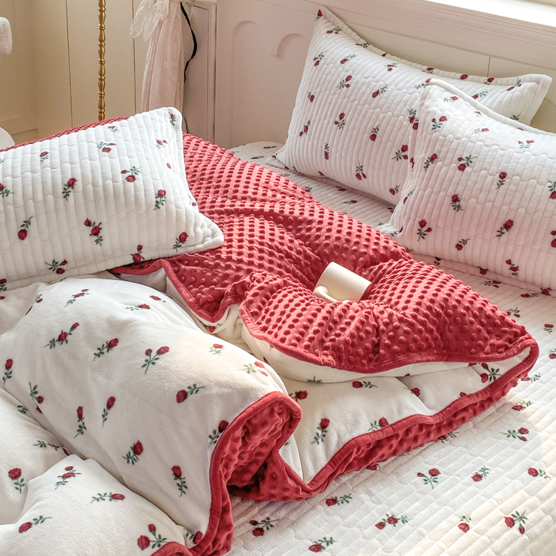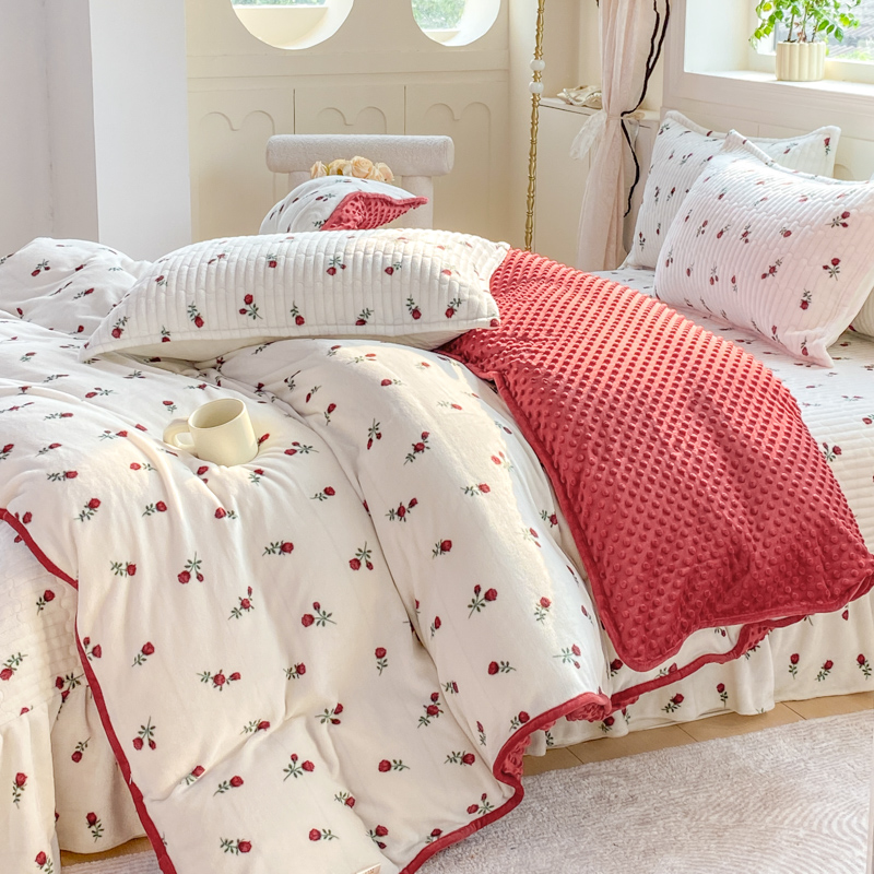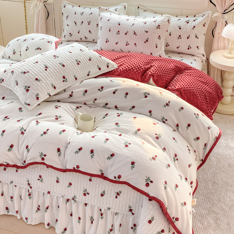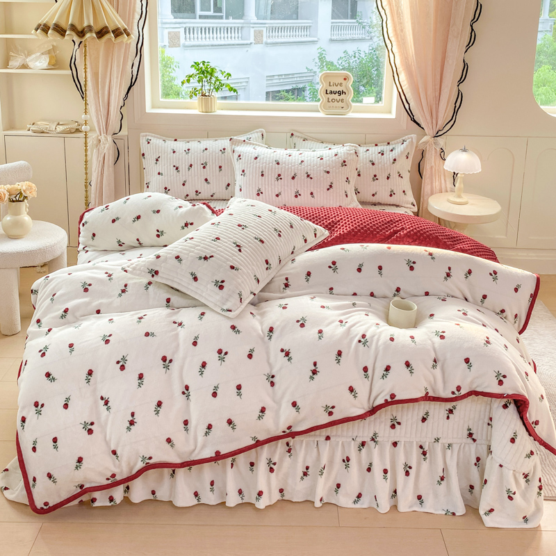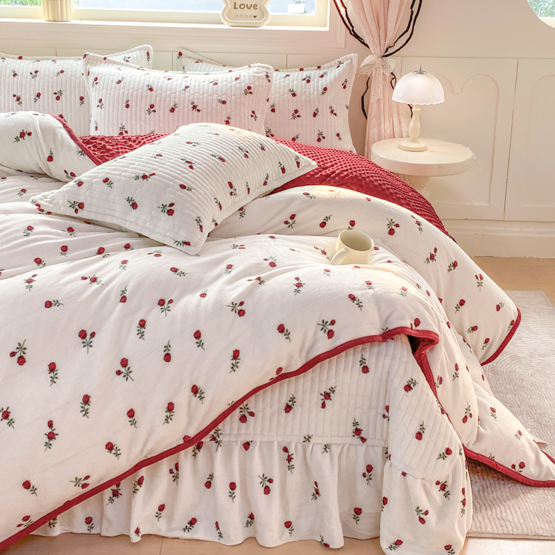 尚美 2025新款豆豆绒牛奶绒大花边床盖四件套(床盖花边随机) 安哥拉红玫瑰