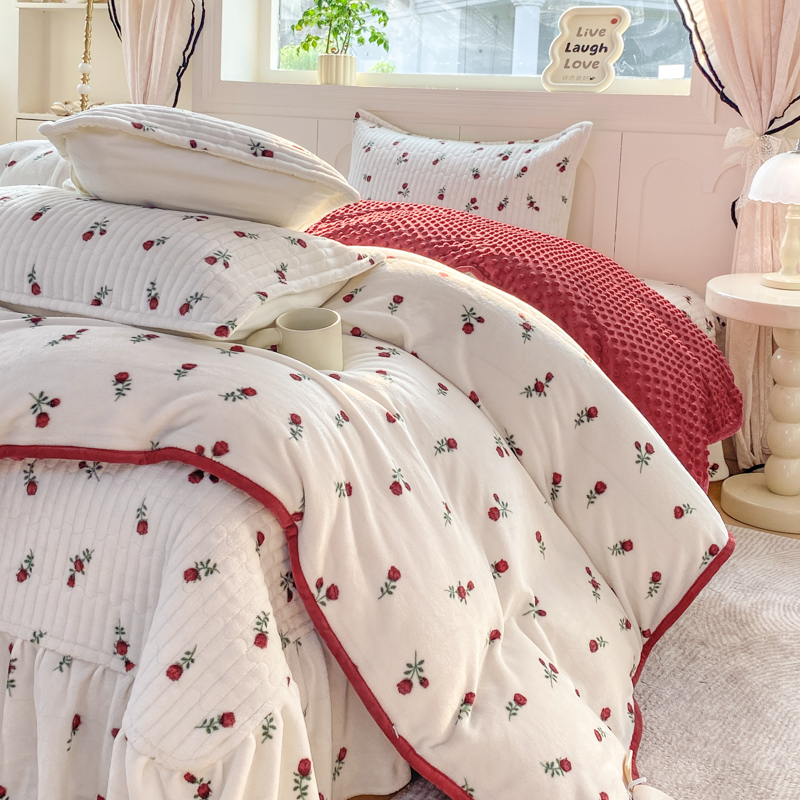 商品名称:尚美 2025新款豆豆绒牛奶绒大花边床盖四件套(床盖花边随机) 安哥拉红玫瑰