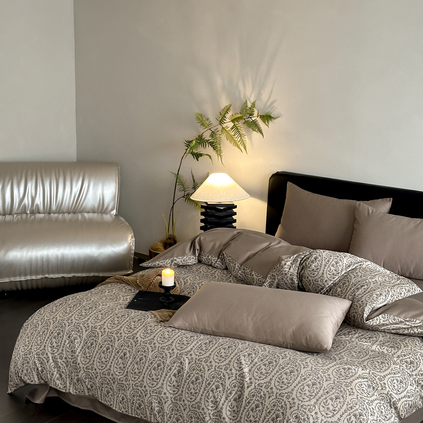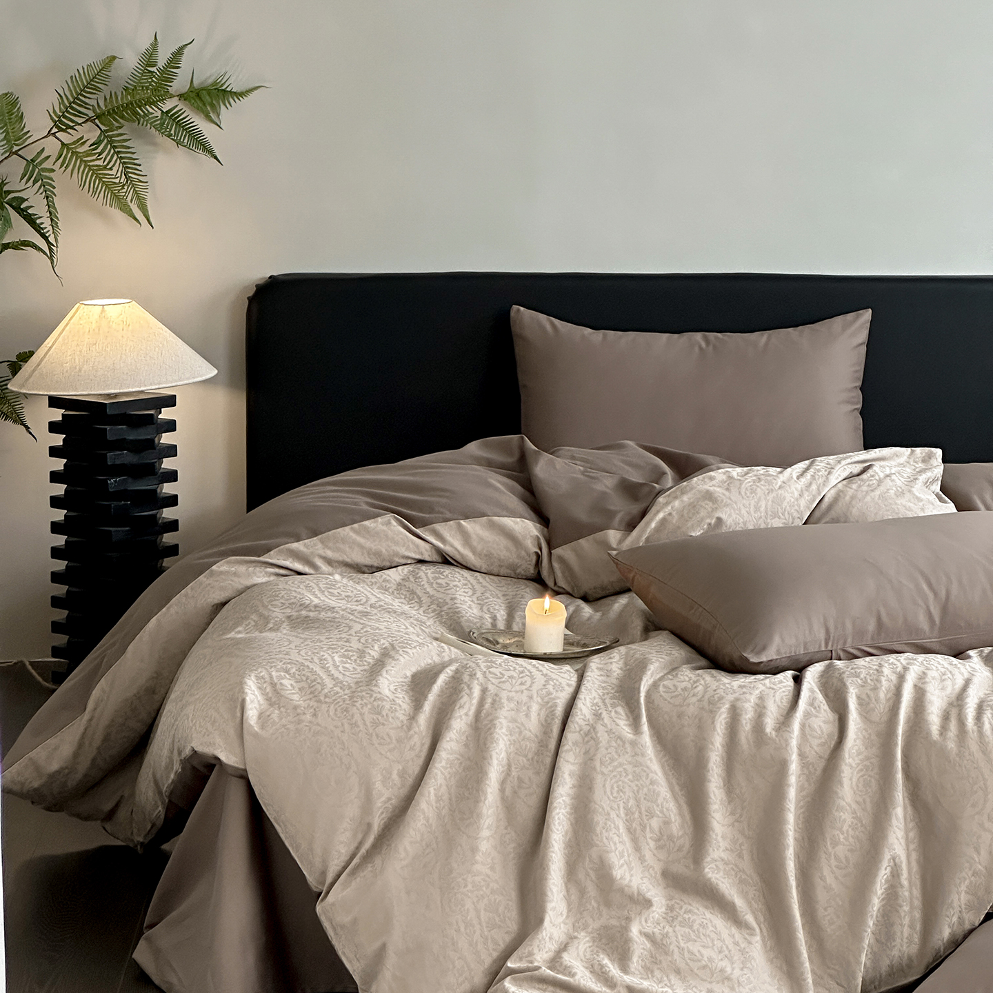 商品名称:赫帛 2025新款60支全棉色织提花磨毛四件套-腰果花 腰果花-灰咖色