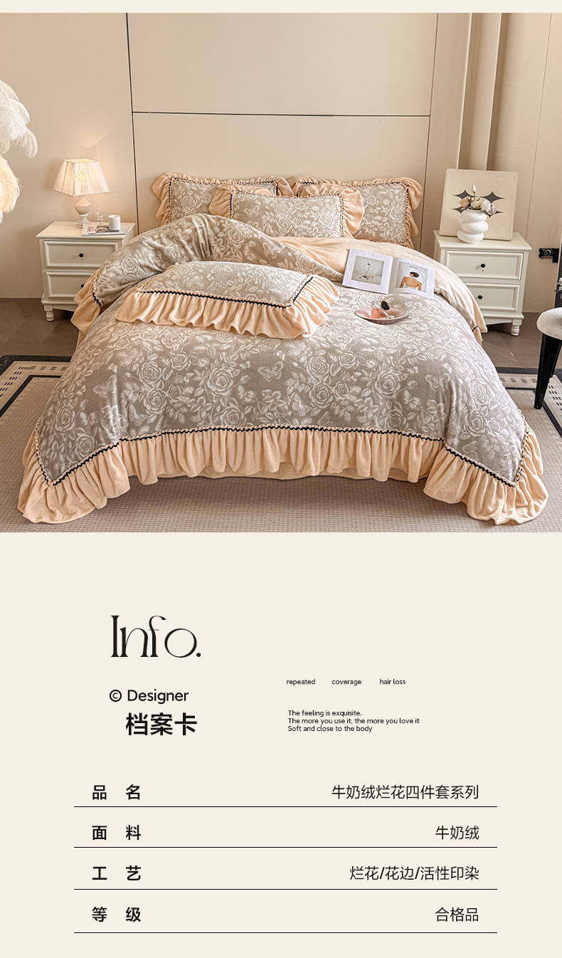 商品名称:民新家纺 2025新款牛奶绒烂花花边款四件套 蝶恋花-羊绒灰