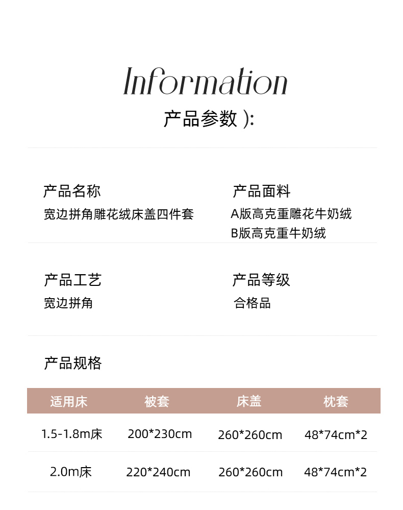 商品名称:(总)孑寐家纺 2025新款宽边拼角雕花绒床盖四件套
