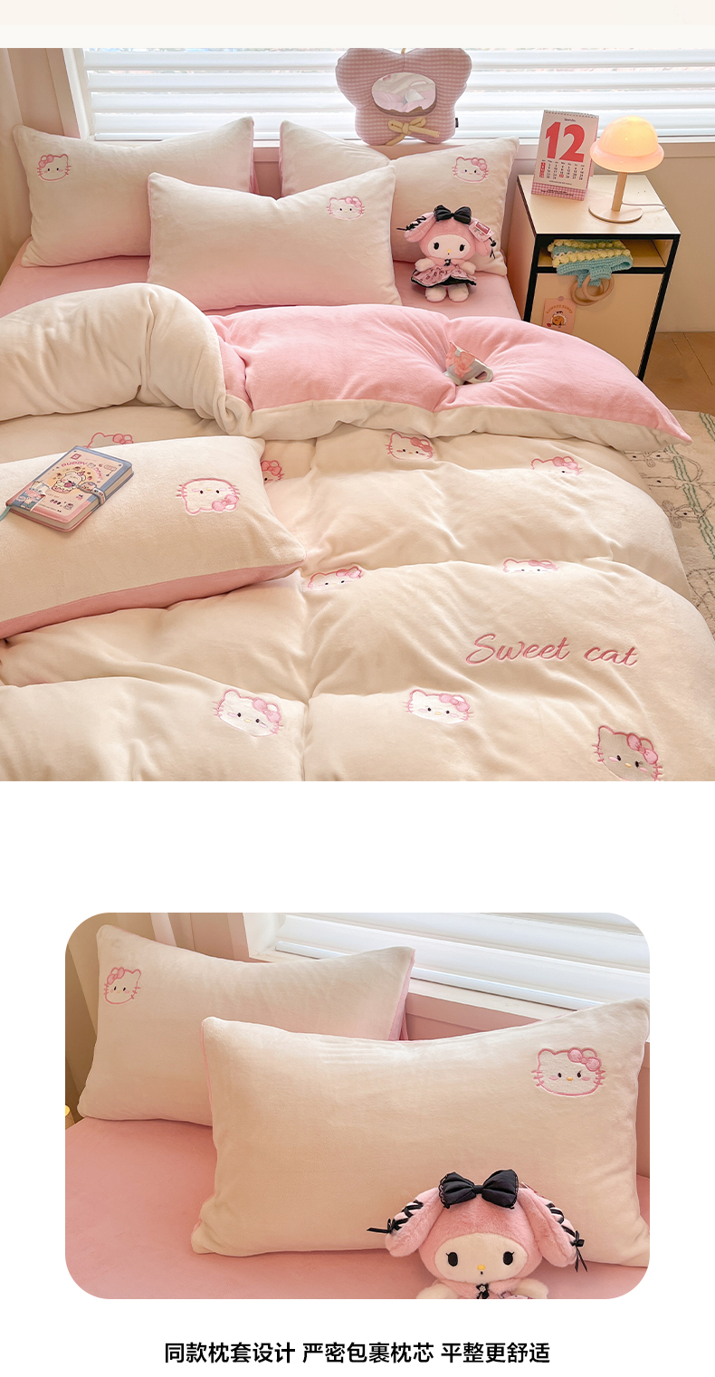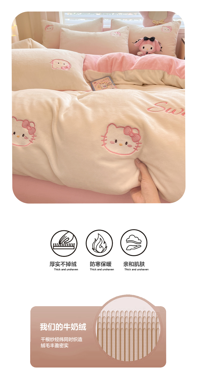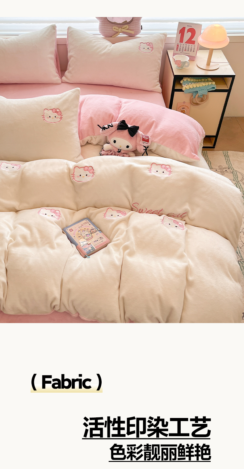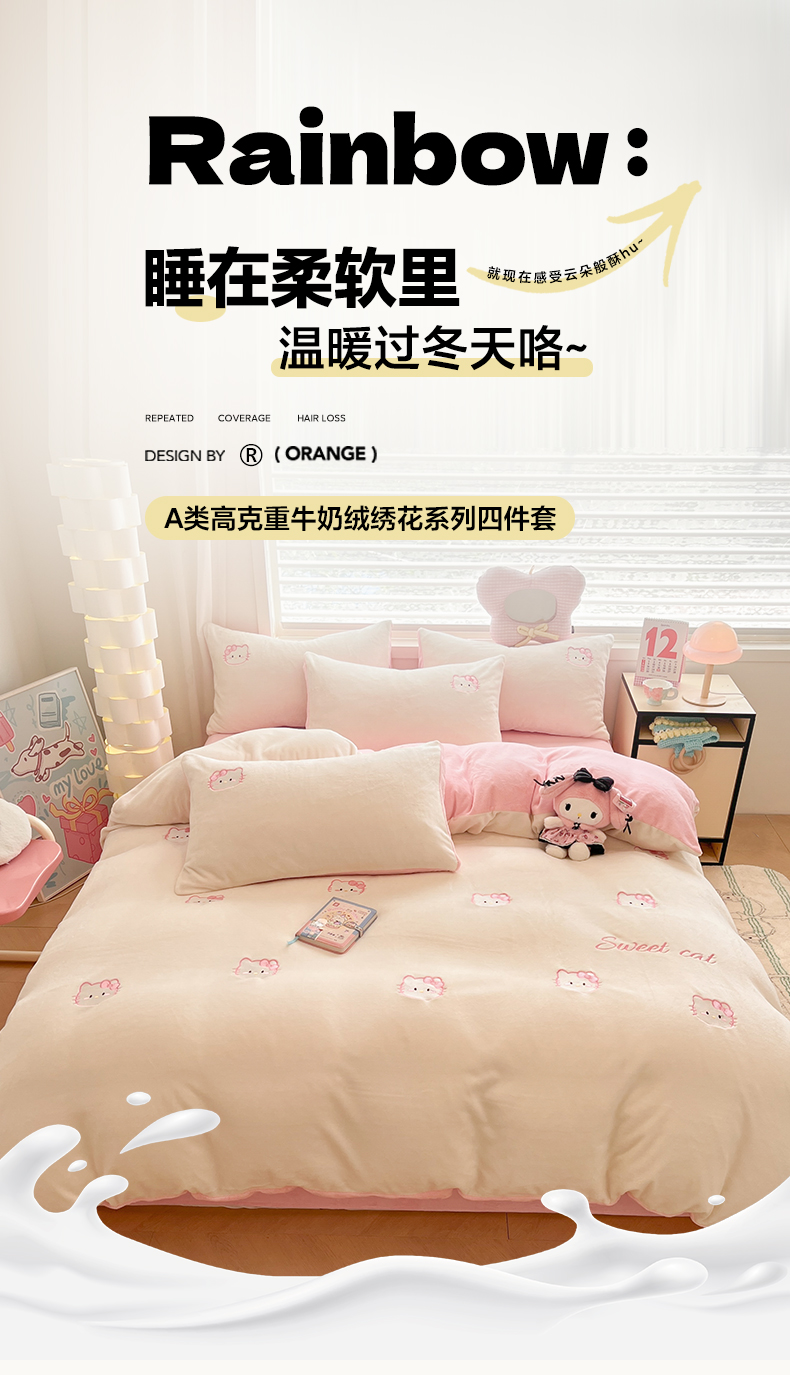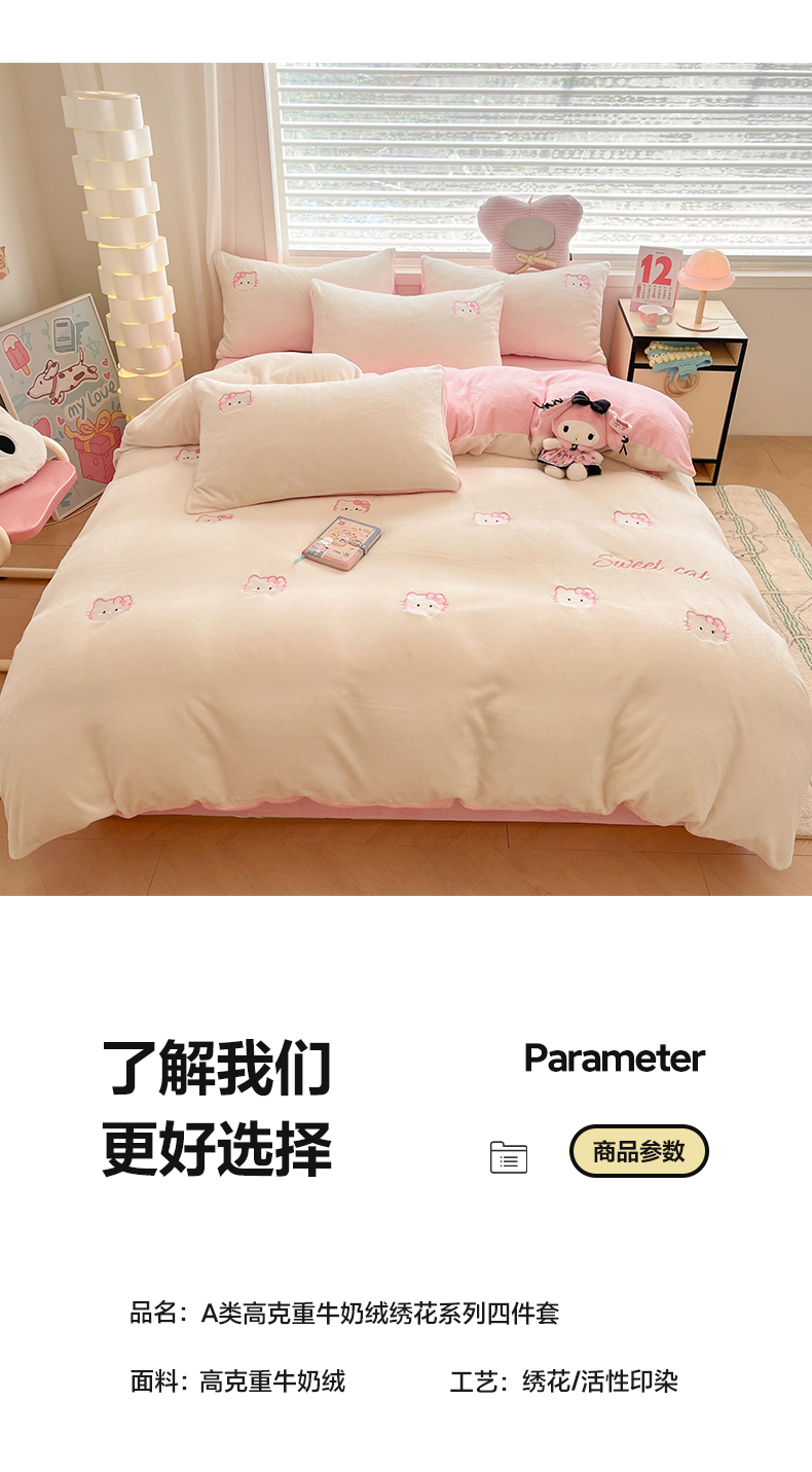 商品名称:如一 2025新款200克缸染高克重精绣牛奶绒四件套 绒-甜心猫-白粉