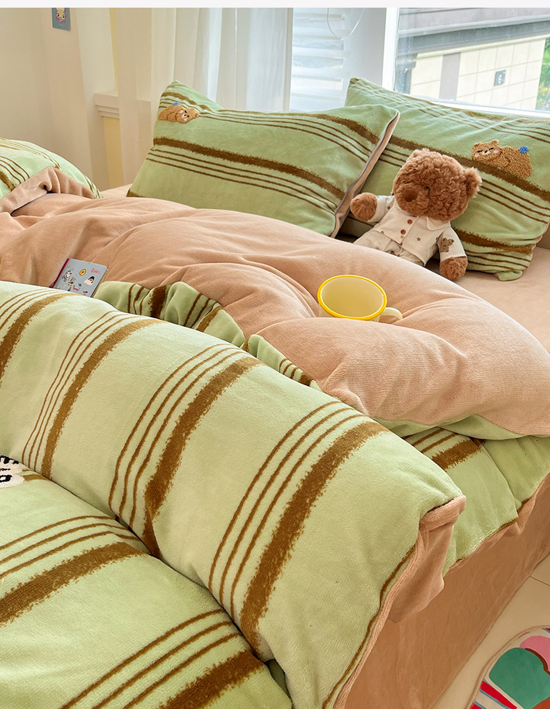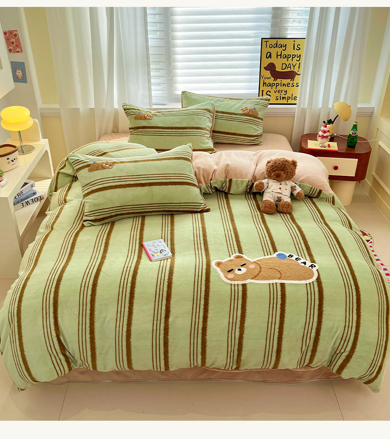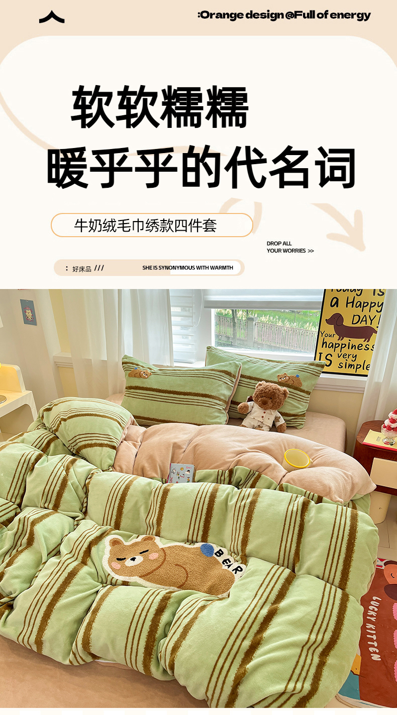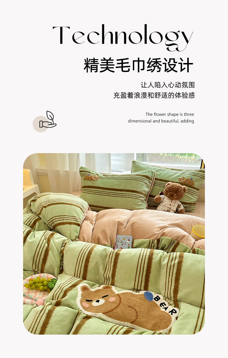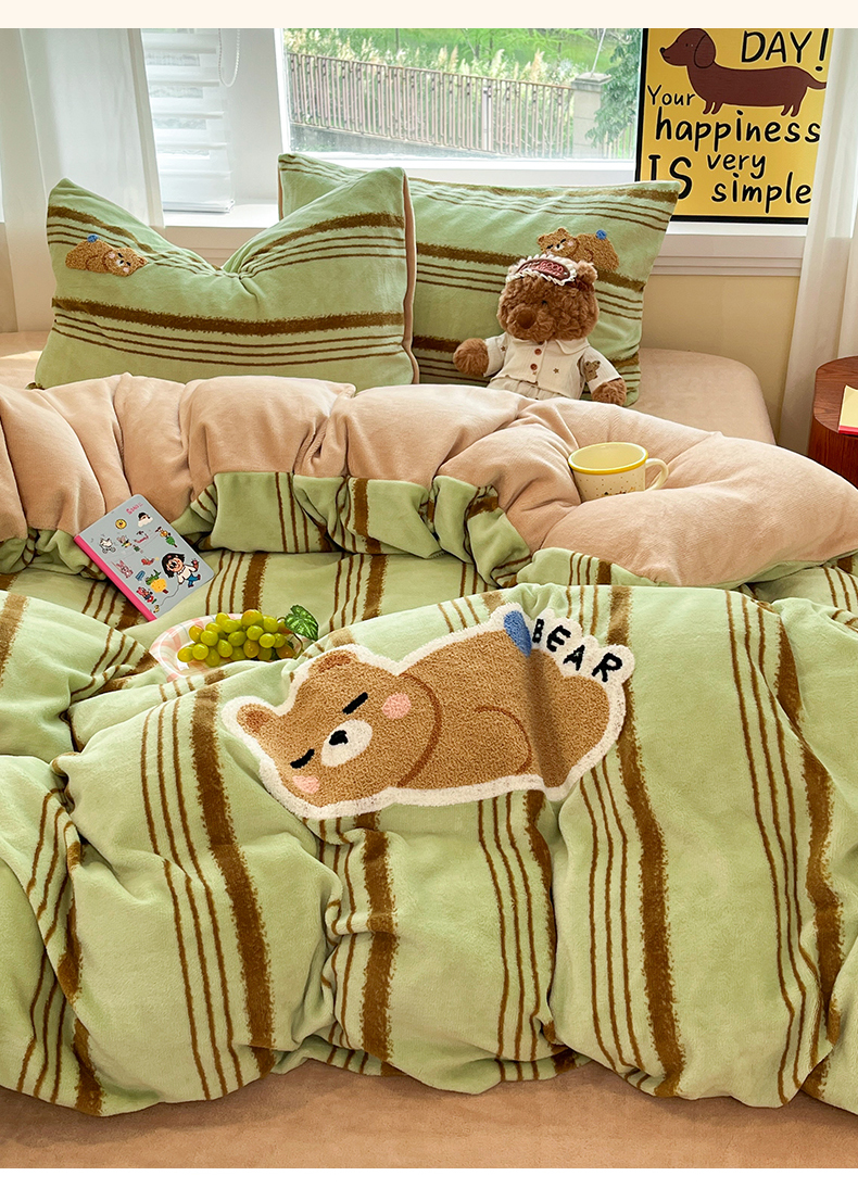 商品名称:首尔家纺 2025新款牛奶绒卡通毛巾绣印加绣系列四件套 绿条小熊