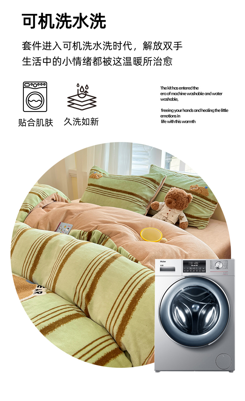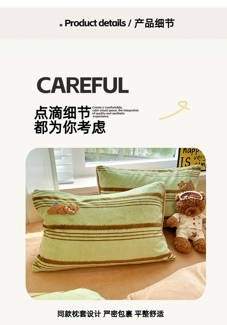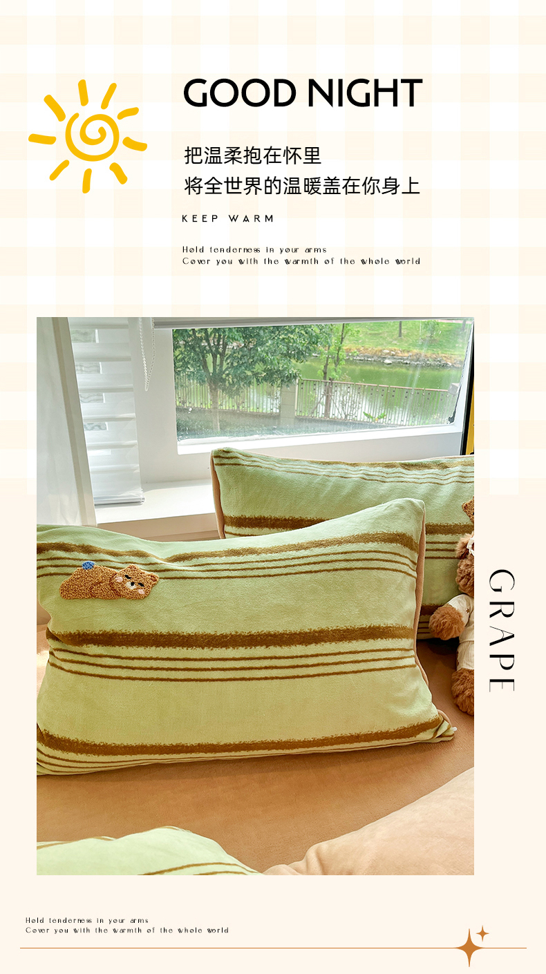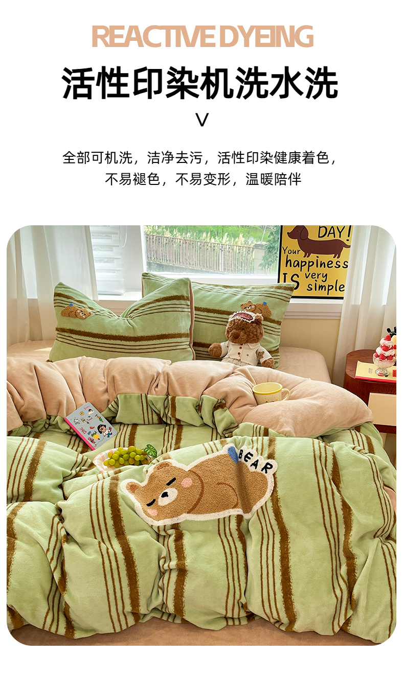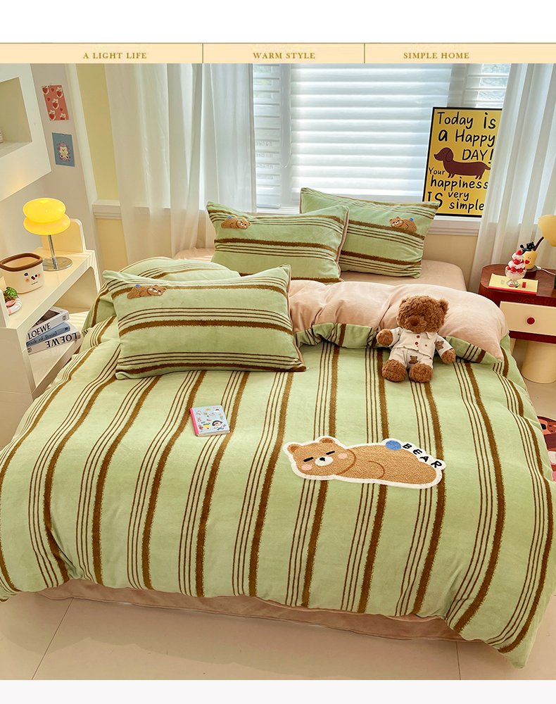 商品名称:首尔家纺 2025新款牛奶绒卡通毛巾绣印加绣系列四件套 绿条小熊