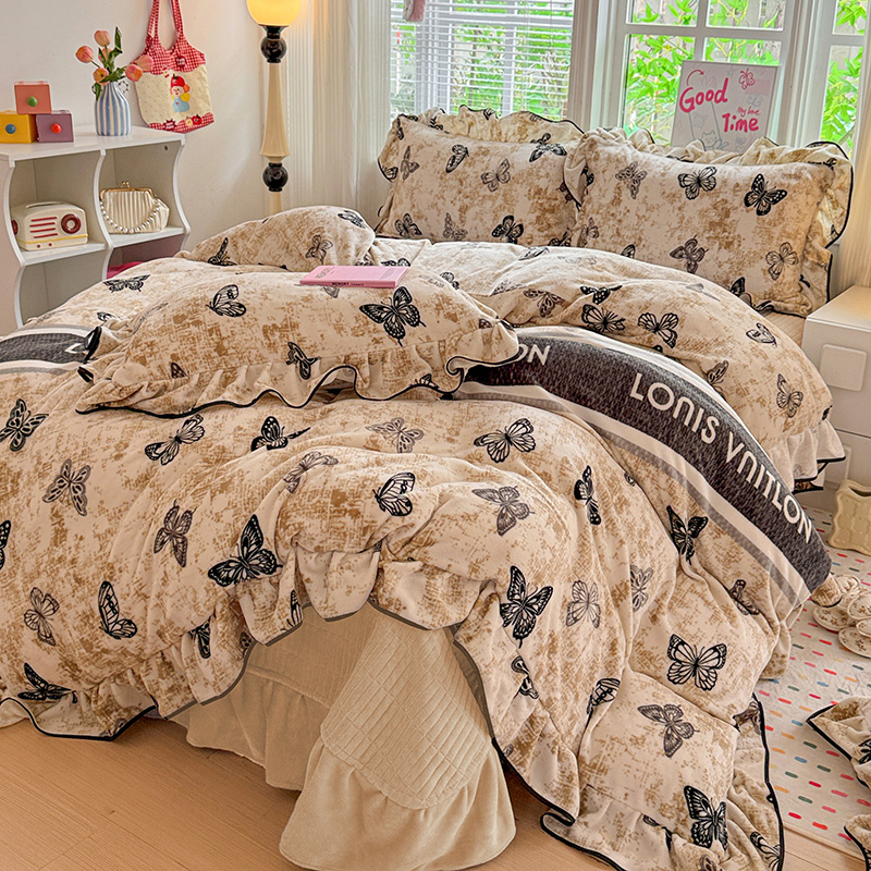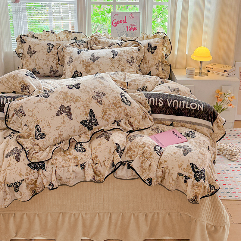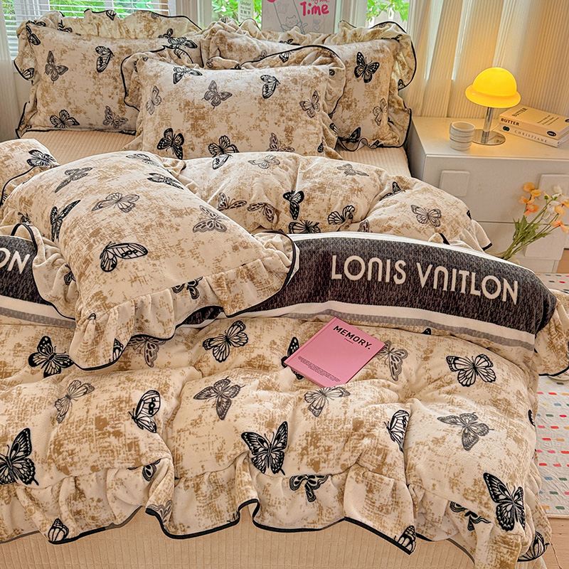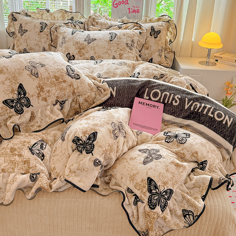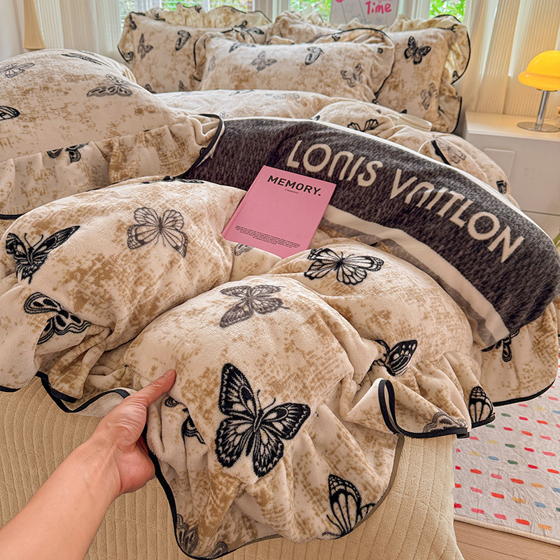 梦莱斯 2025新款加厚保暖双面牛奶绒四件套-黑色花边款 蝶舞