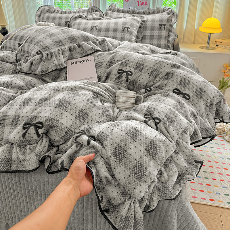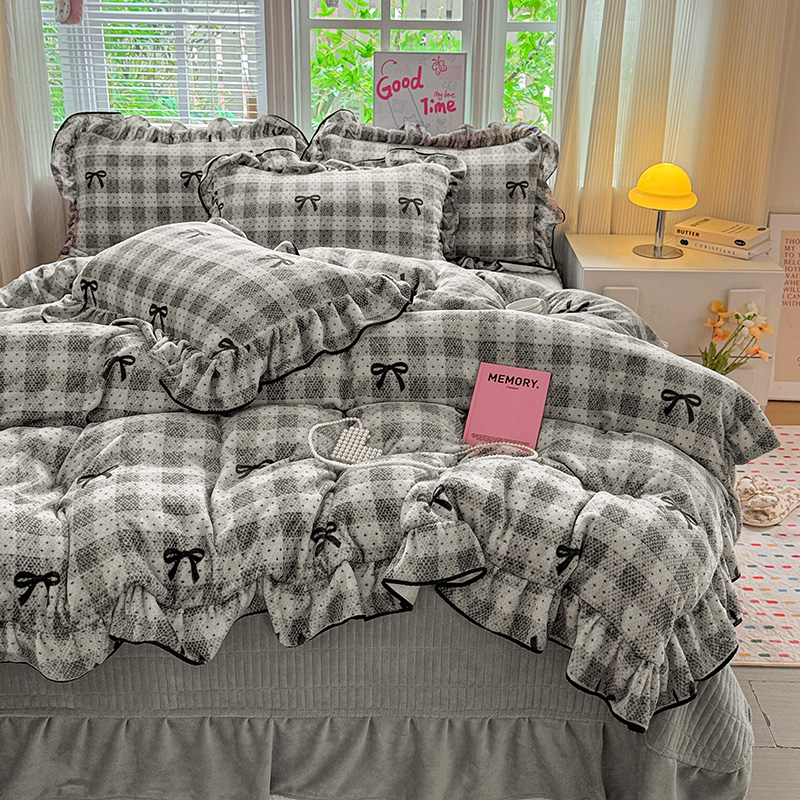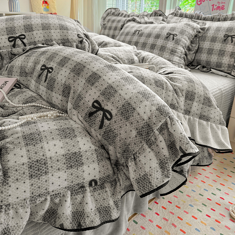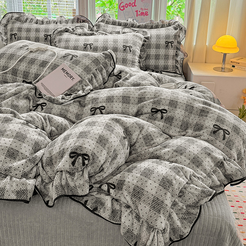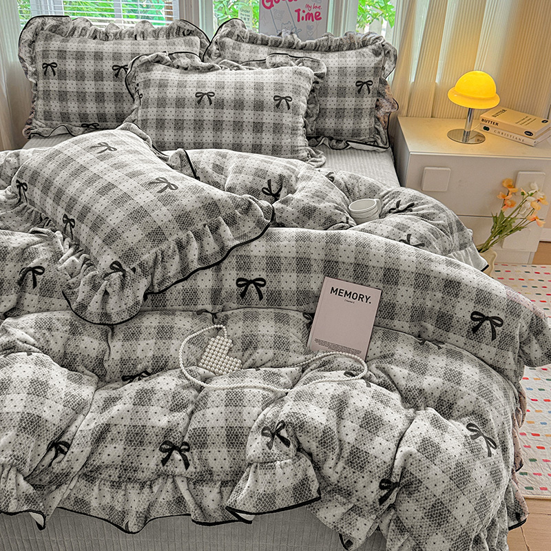 梦莱斯 2025新款加厚保暖双面牛奶绒四件套-黑色花边款 蝴蝶结