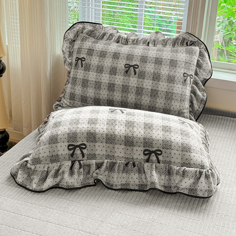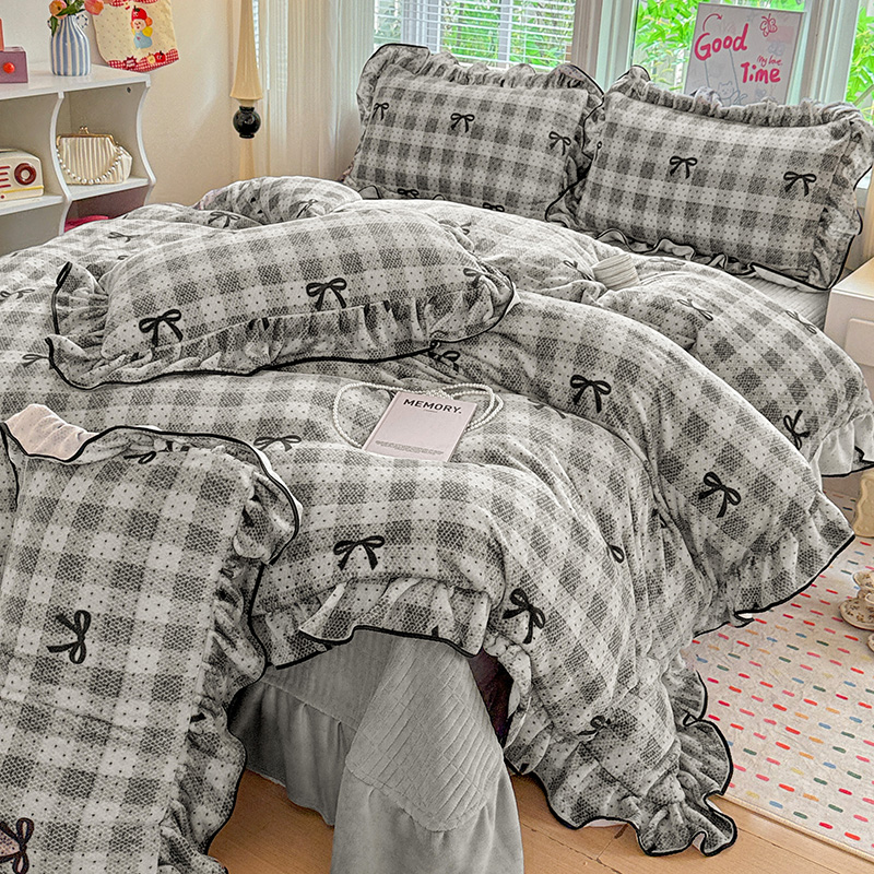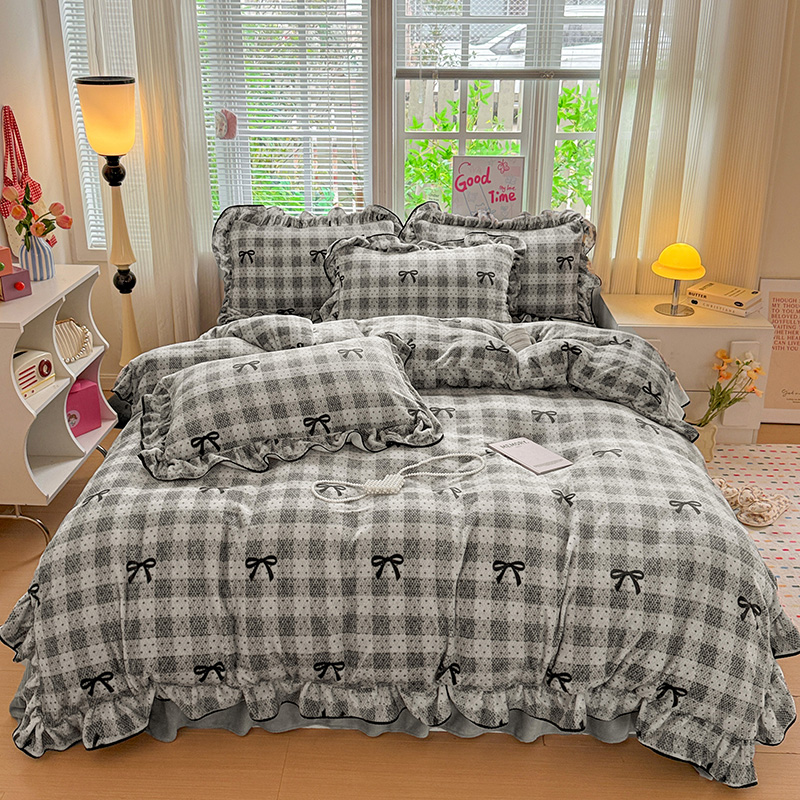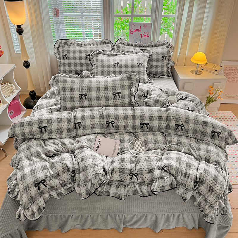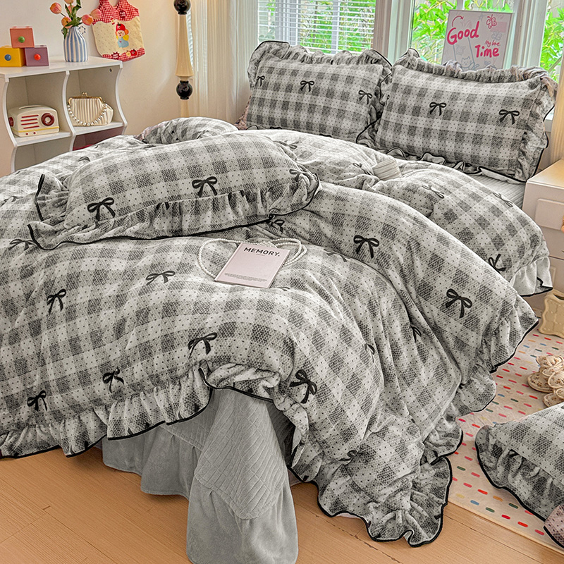 梦莱斯 2025新款加厚保暖双面牛奶绒四件套-黑色花边款 蝴蝶结