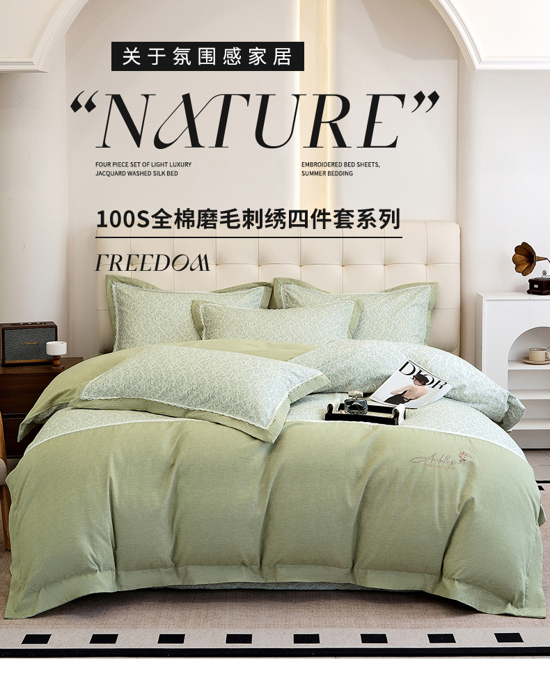 OL家纺 2025新款100s全棉磨毛印染加刺绣四件套(控价1.5/1.8标准被套折券后368元!!!) 苹果绿