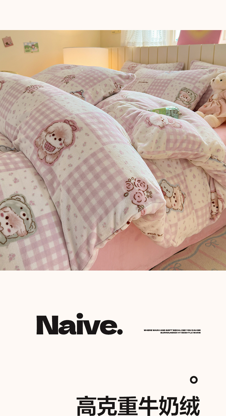 (总)丽美人家纺 2025新款小版印花牛奶绒四件套,拼布蝴蝶兔,山茶花语-粉,水墨花蝴蝶,甜品腊肠狗,甜心猫咪-蓝,英伦小狗,油画小萌物,春风沐歌,春日女孩,复古山茶,格子小狗,花边小兔,可爱小猫,玫瑰女孩,萌熊日记,奶萌小猫