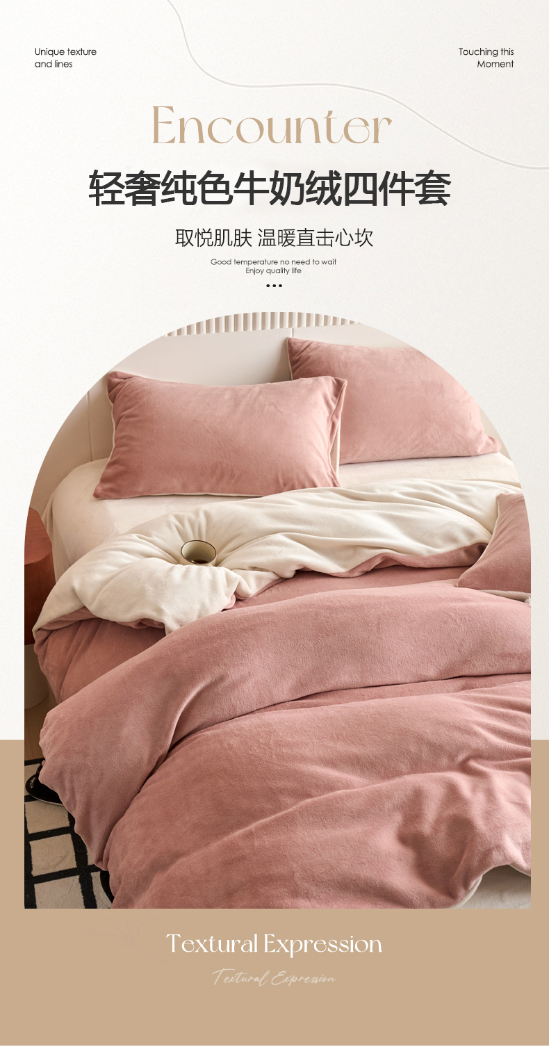 当前位置: 91家纺网 > 商品网购 > 床品套件 > 四件套 > 牛奶绒四件套 > 乐居家纺 2025新款200克重纯色单面绒牛奶绒四件套 星柚粉+奶昔白