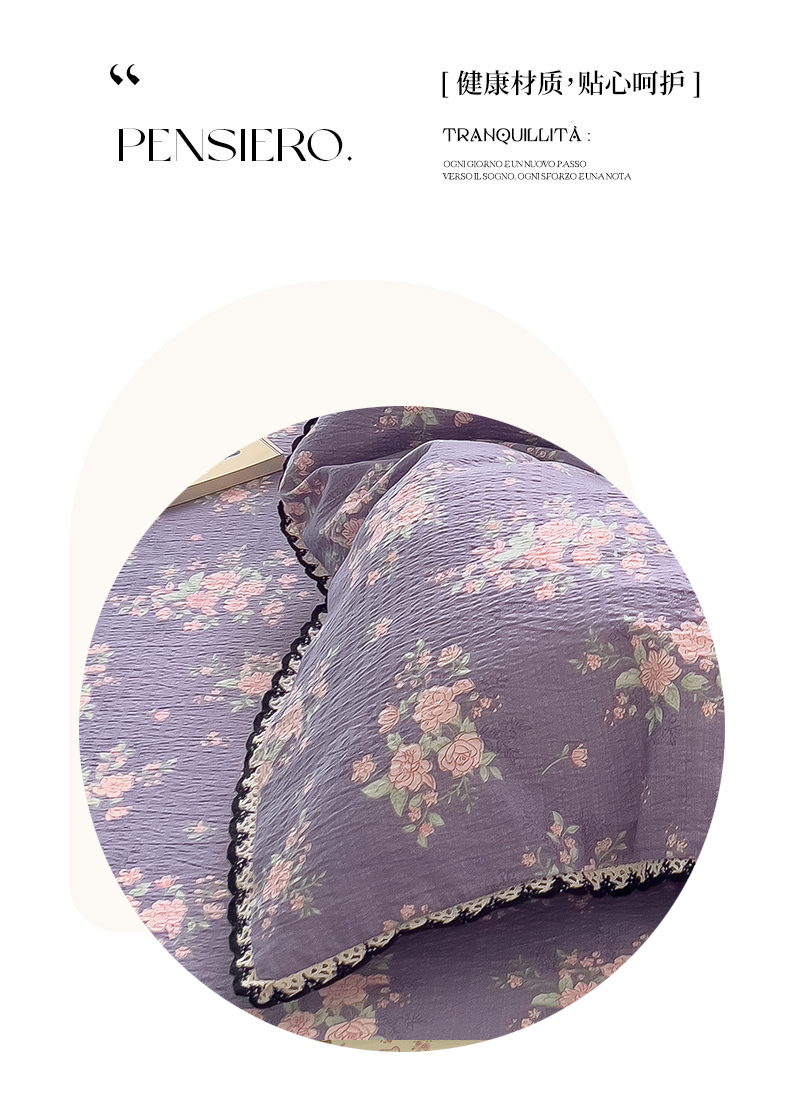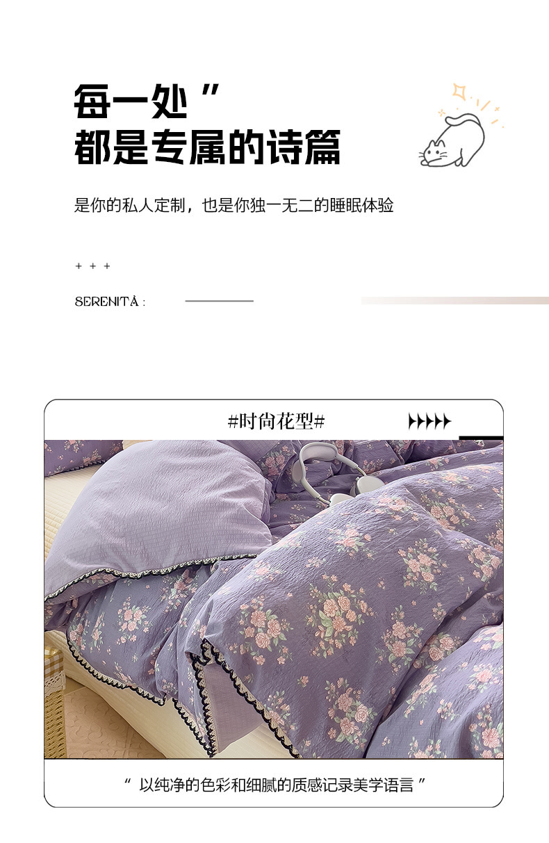• 91家纺网 家纺一手货源 找家纺 三盛源 2025新款韩系小花卉镂空花边超柔皱皱双层纱水洗棉单被套被套单件 紫萝漫想