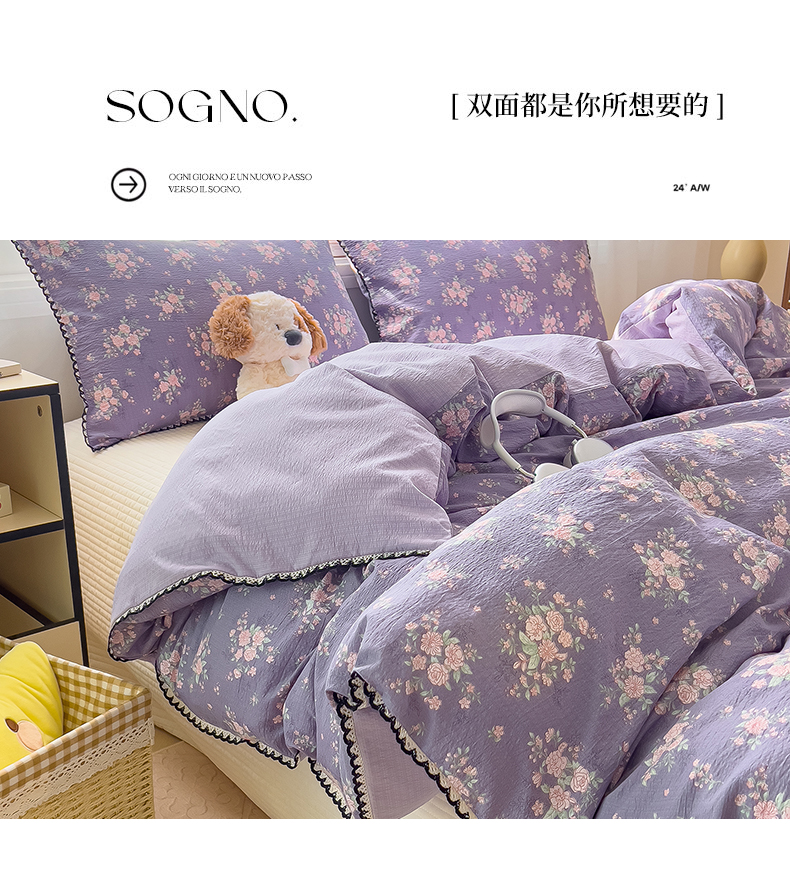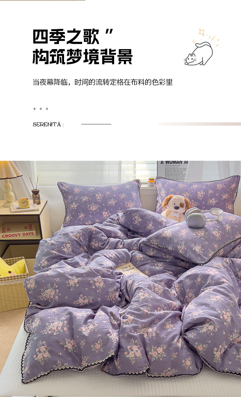 • 91家纺网 家纺一手货源 找家纺 (总)三盛源 2025新款韩系小花卉镂空花边超柔皱皱双层纱水洗棉单被套被套单件,绿野,萌趣小窝,奶油星点,泡芙小狗,桃粉,絮语,紫萝漫想,紫米樱桃