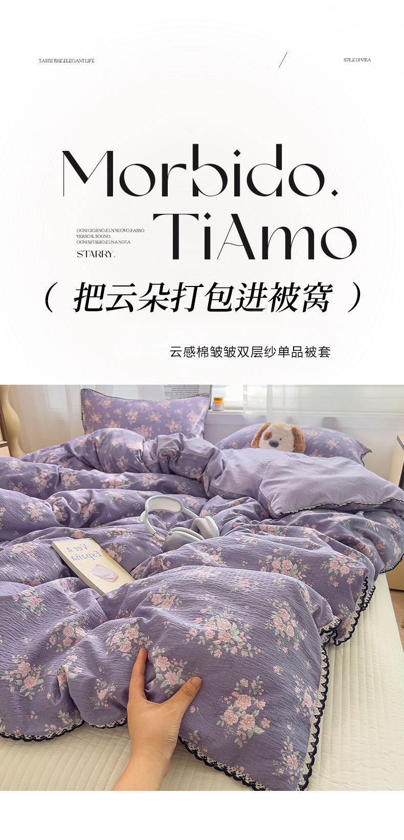 (总)三盛源 2025新款韩系小花卉镂空花边超柔皱皱双层纱水洗棉单被套被套单件,绿野,萌趣小窝,奶油星点,泡芙小狗,桃粉,絮语,紫萝漫想,紫米樱桃