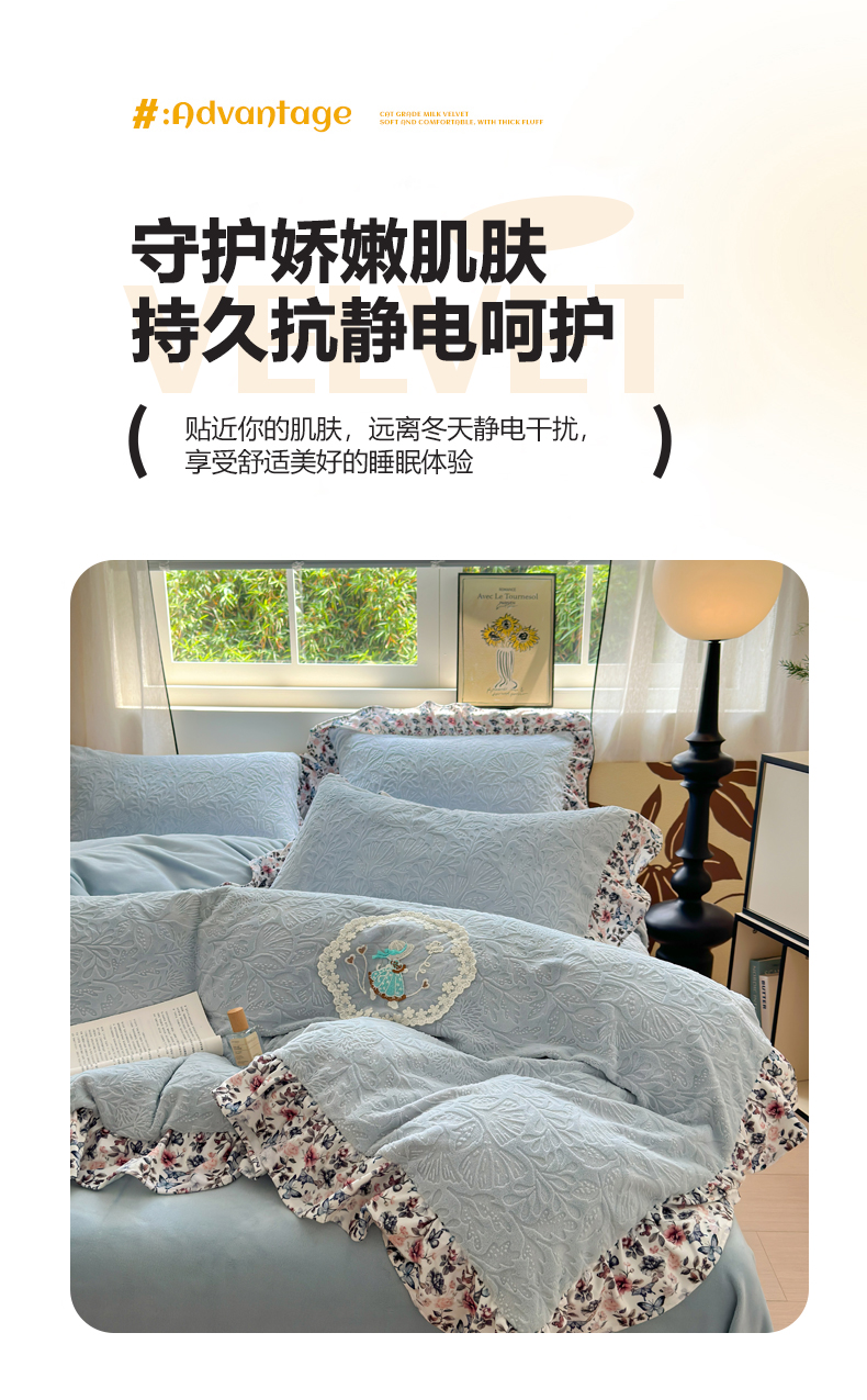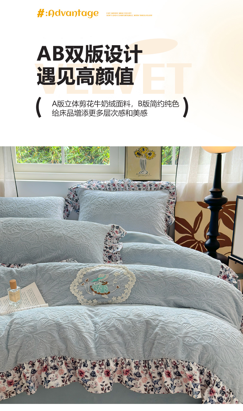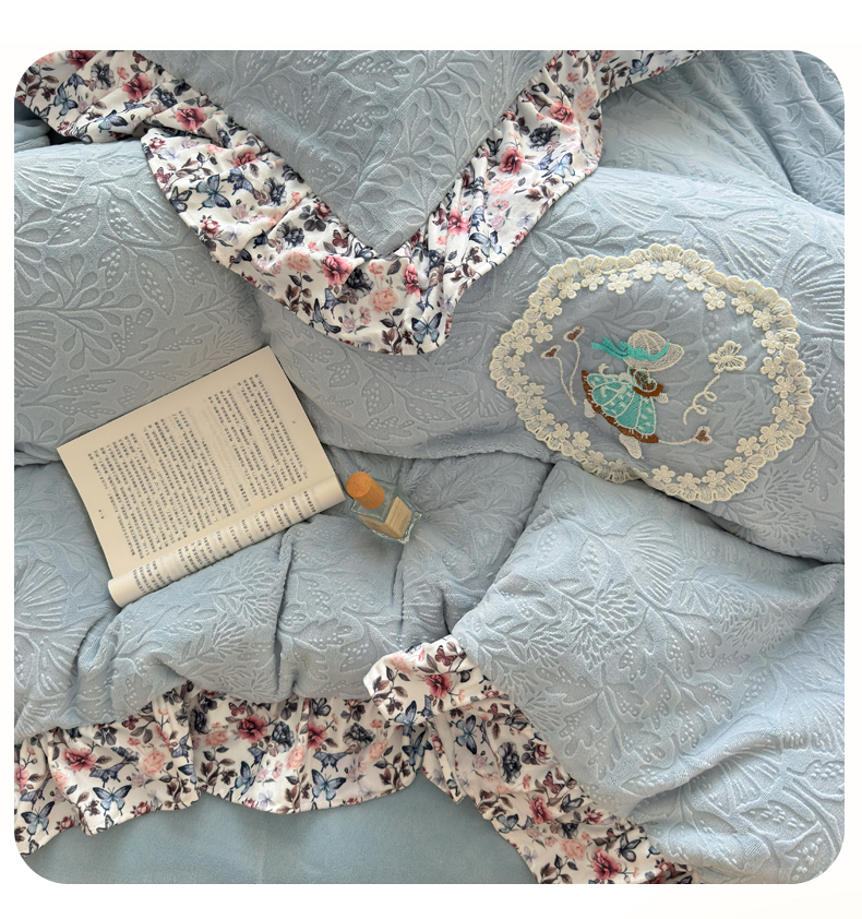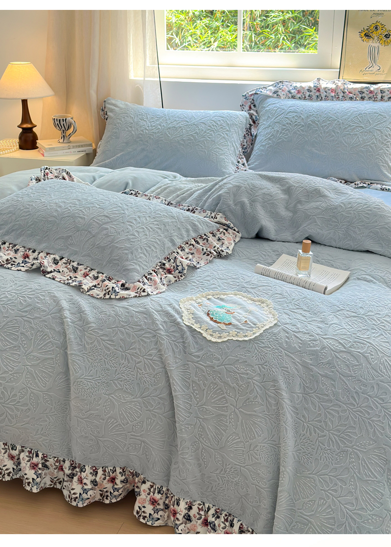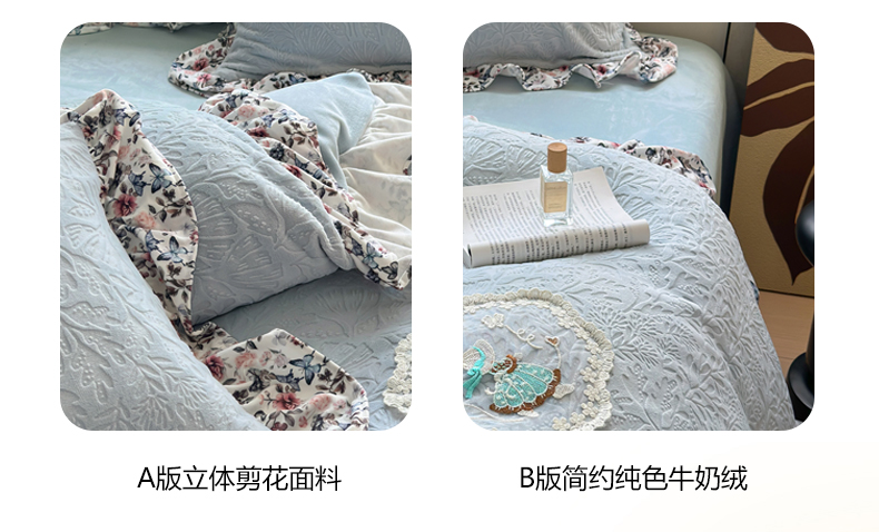 当前位置: 91家纺网 > 商品网购 > 床品套件 > 四件套 > 牛奶绒四件套 > 乐居家纺 2025新款蝴蝶花边款剪花提花牛奶绒四件套(含买家秀和质检报告) 蝴蝶花边款-幸运叶-蓝
