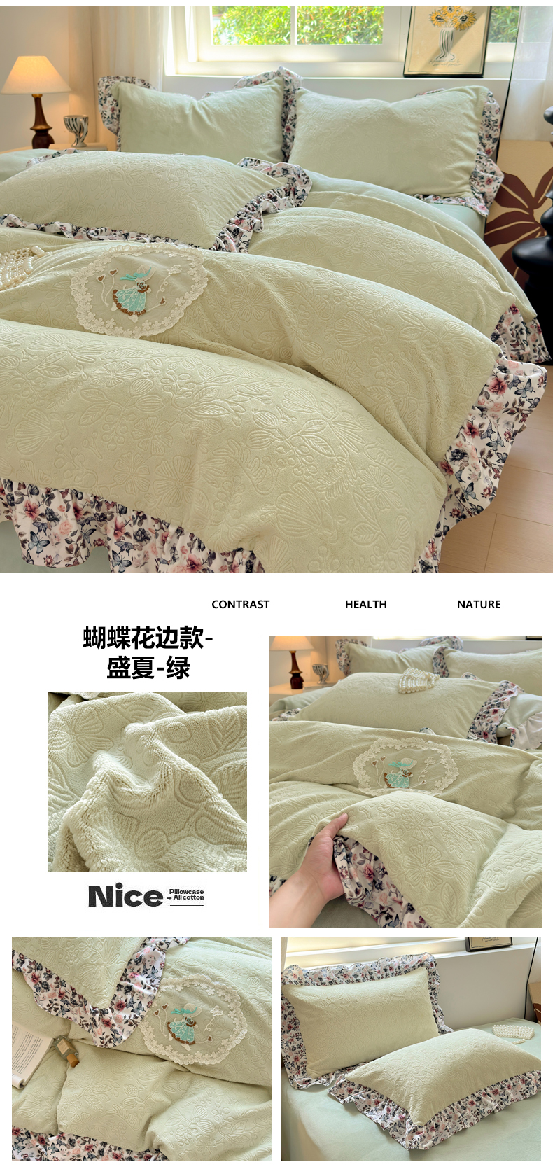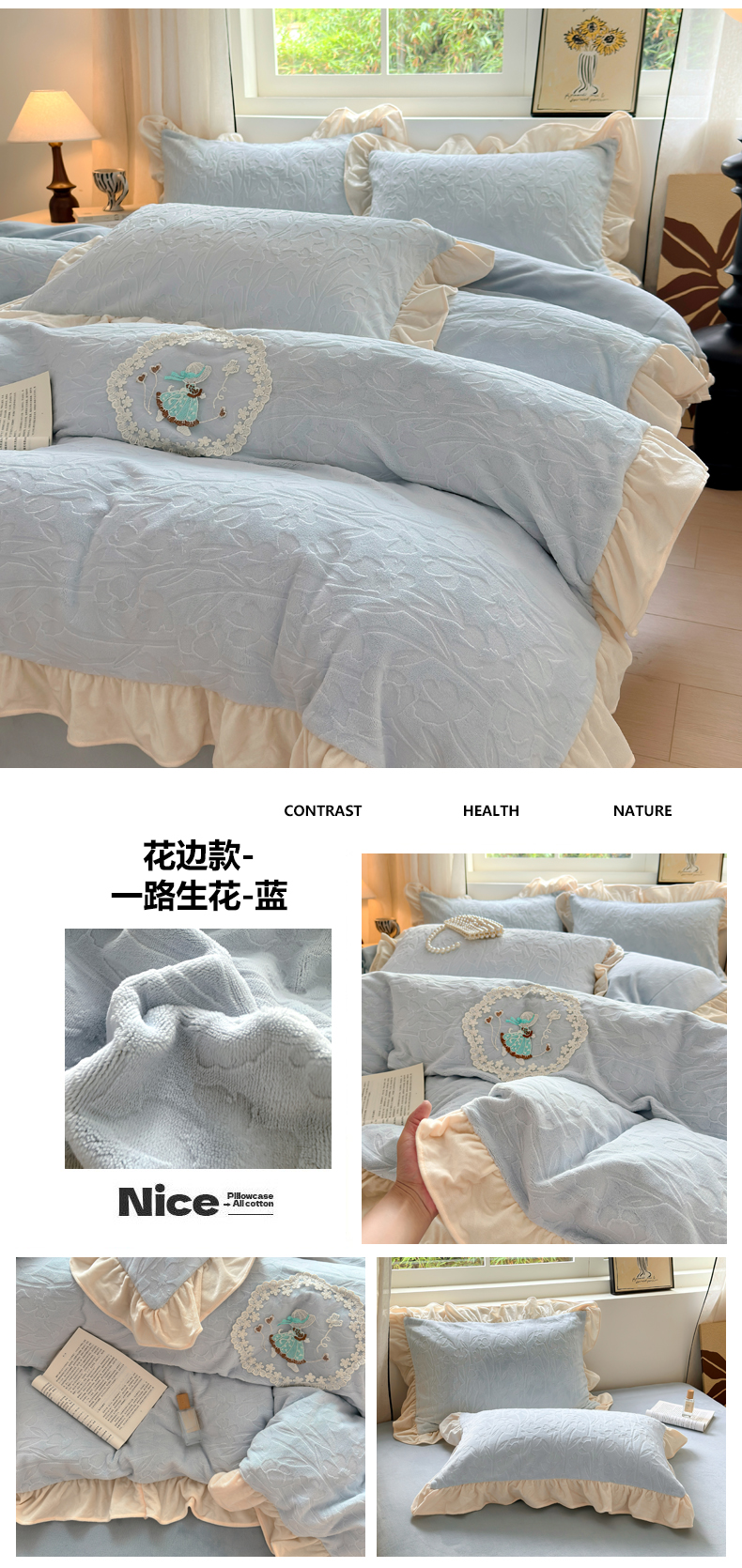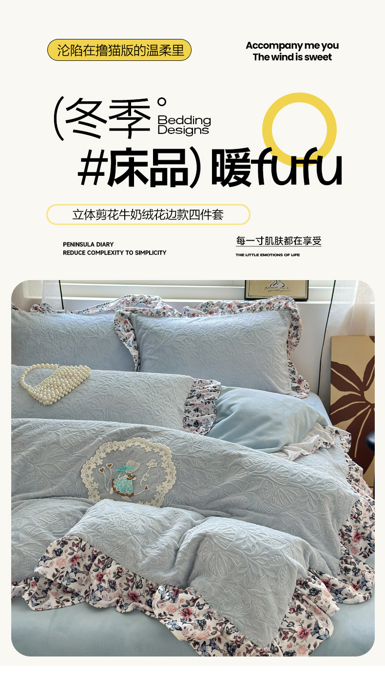 当前位置: 91家纺网 > 商品网购 > 床品套件 > 四件套 > 牛奶绒四件套 > 乐居家纺 2025新款蝴蝶花边款剪花提花牛奶绒四件套(含买家秀和质检报告) 蝴蝶花边款-幸运叶-蓝