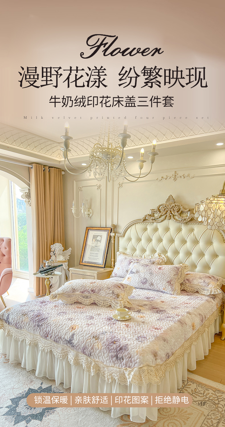 商品名称:网红馆(ck家纺) 2025新款牛奶绒印花床盖三件套 花织