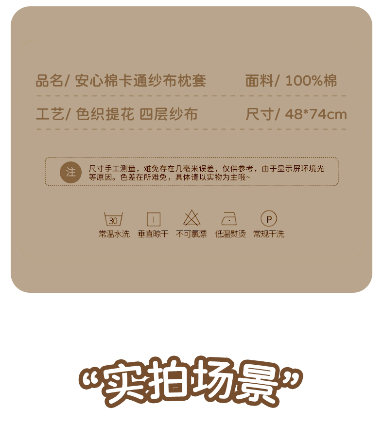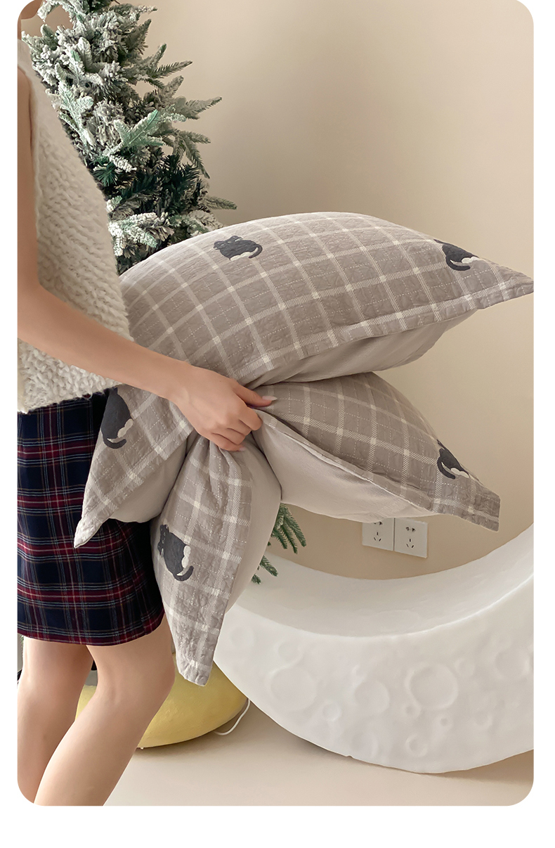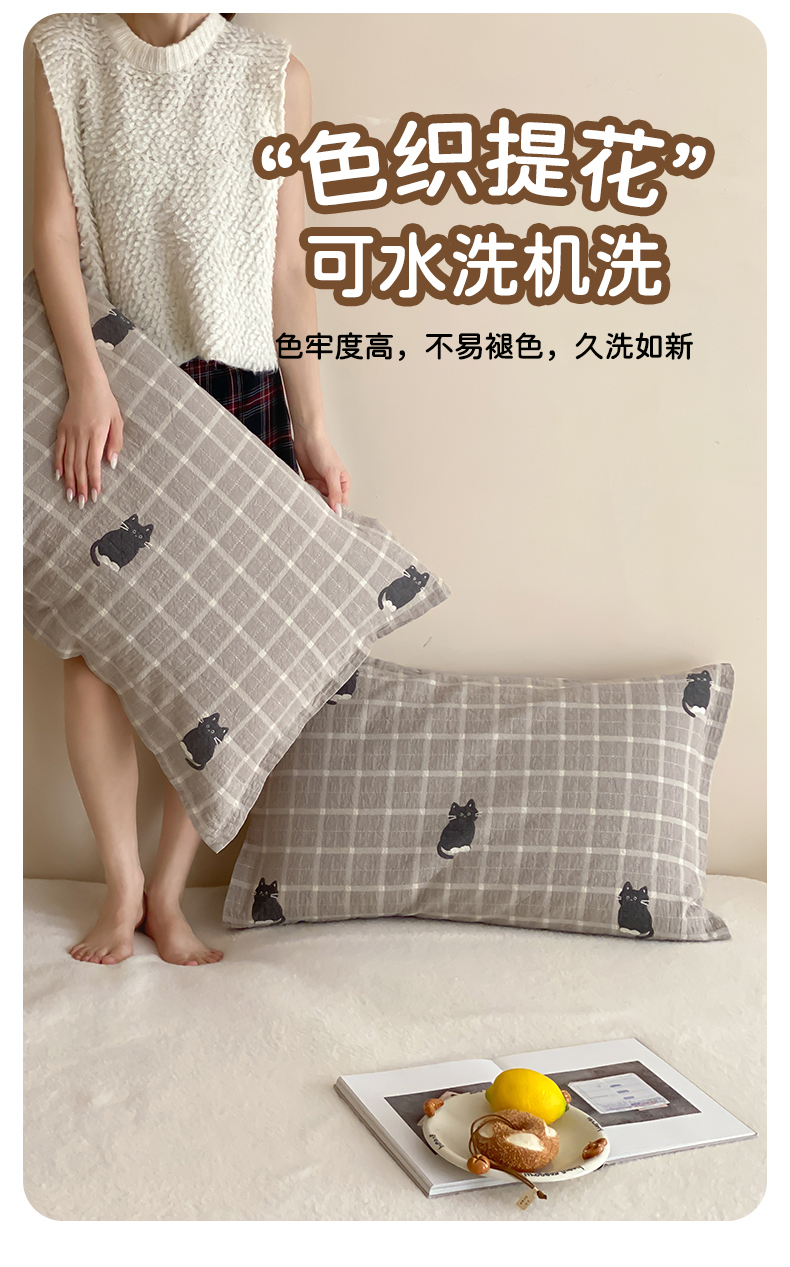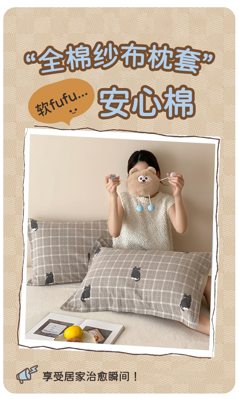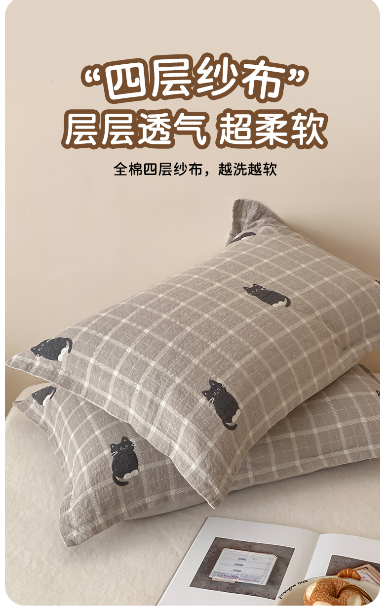 商品名称:麻依 2025新款安心棉纱布枕套全棉四层纱布枕套 可可猫咪-奶茶色