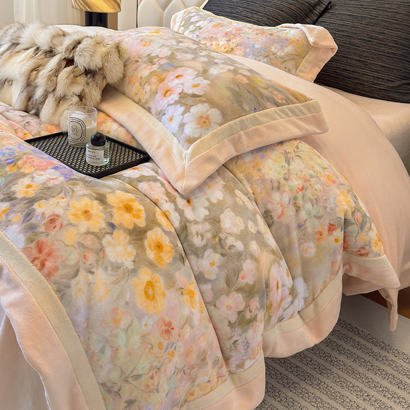 商品名称:若未家居 LOVEWE HOUSE 2025新款250克全消光数码印花牛奶绒双拼角四件套 簪花-粉
