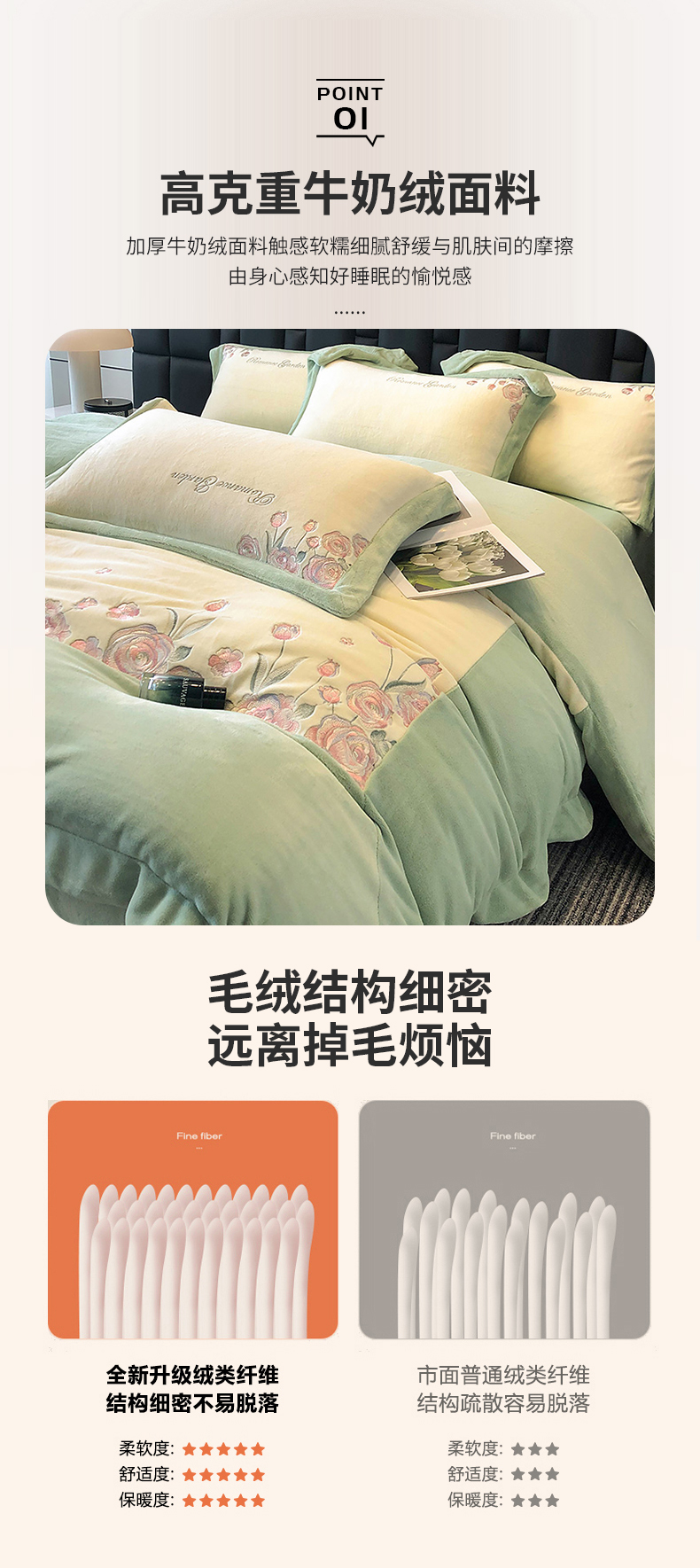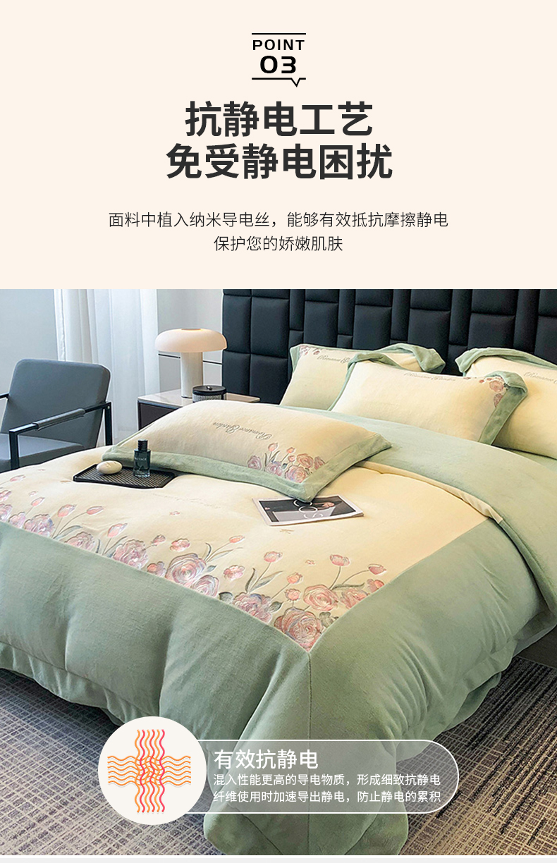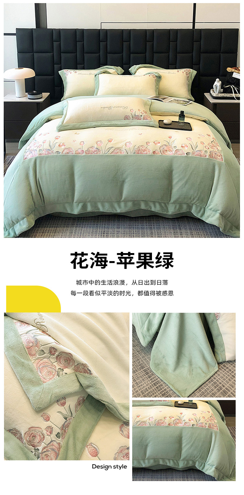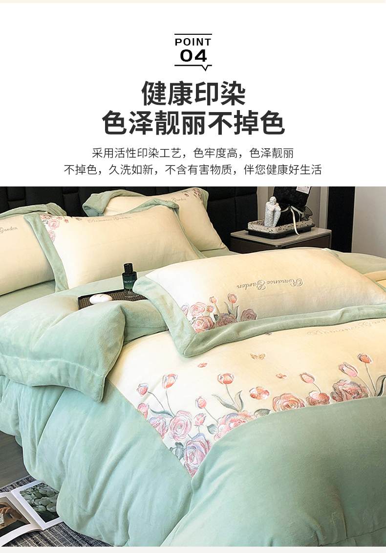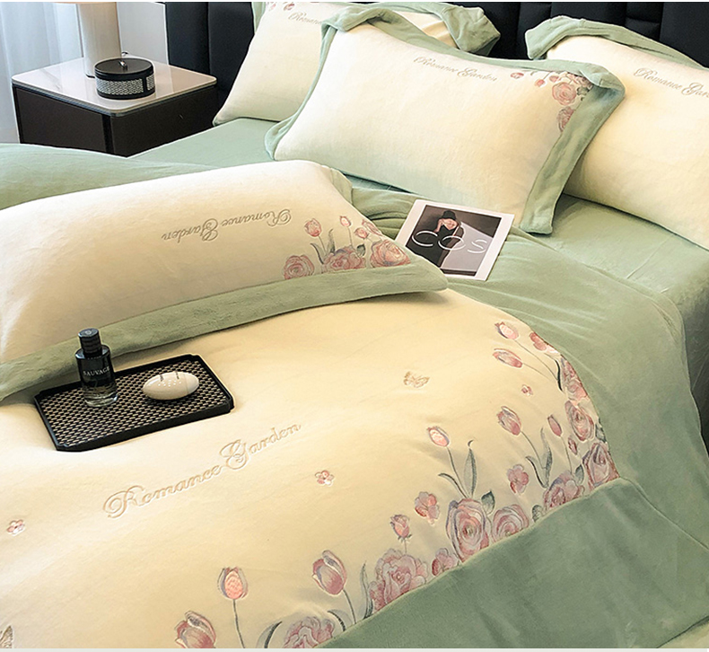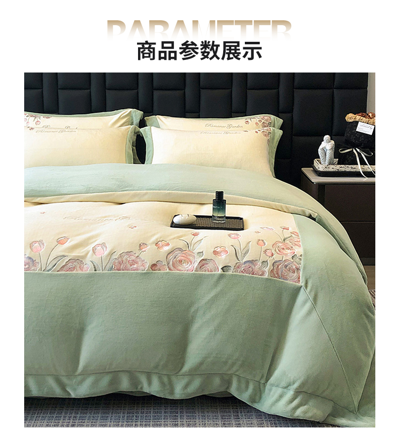 商品名称:家居1号家纺 2025新款230克A类全消光牛奶绒四件套-花海 花海-苹果绿