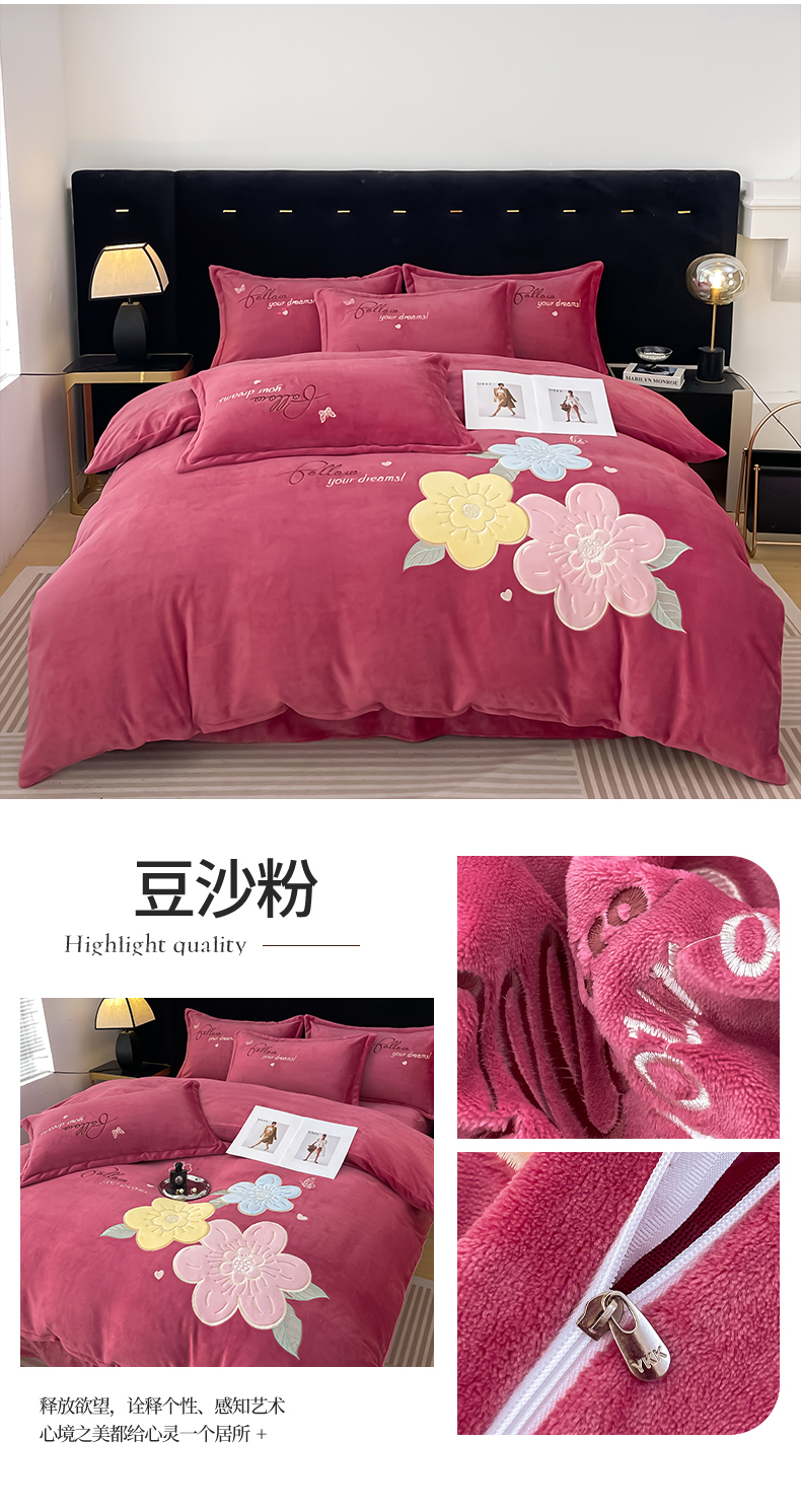 商品名称:绒小宣 2025新A类牛奶绒贴布绣四件套-花语 花语-豆沙色