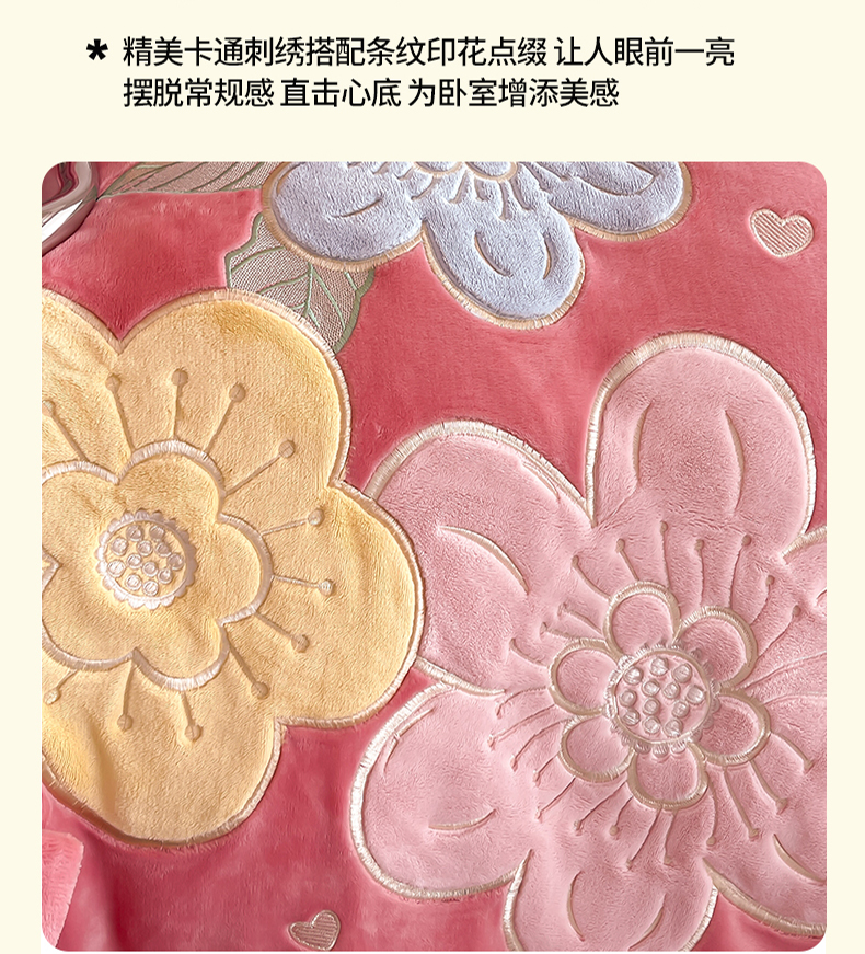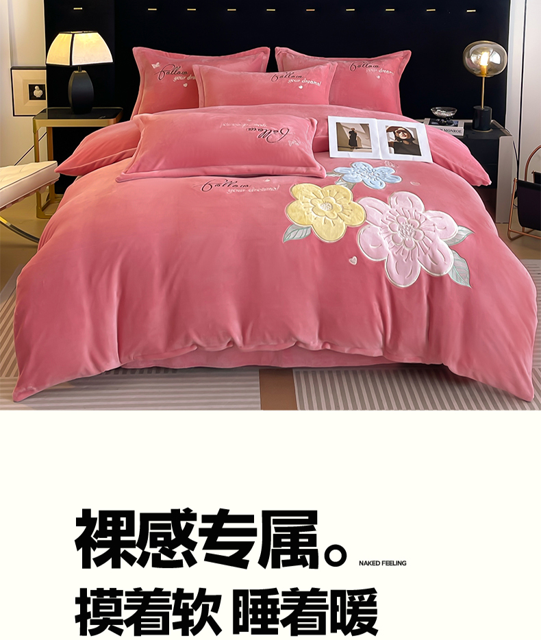绒小宣 2025新款高克重牛奶绒刺绣四件套 花开富贵-粉,花开富贵-粉