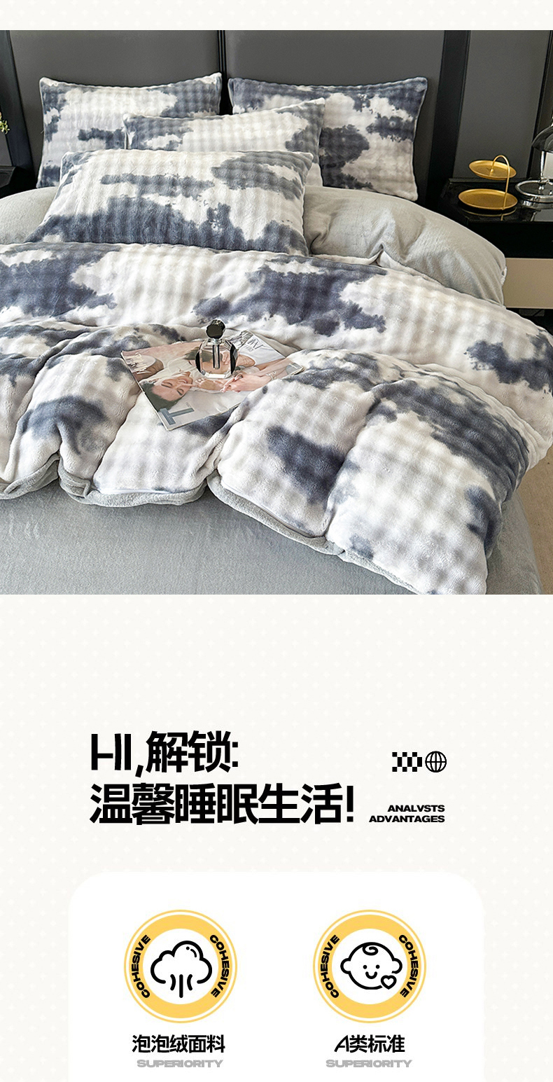 商品名称:梵克保罗 2025秋冬新款炫彩水墨画仿兔毛绒大泡泡绒印花大理石纹渐变高克重四件套 石墨灰