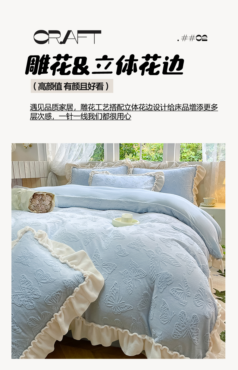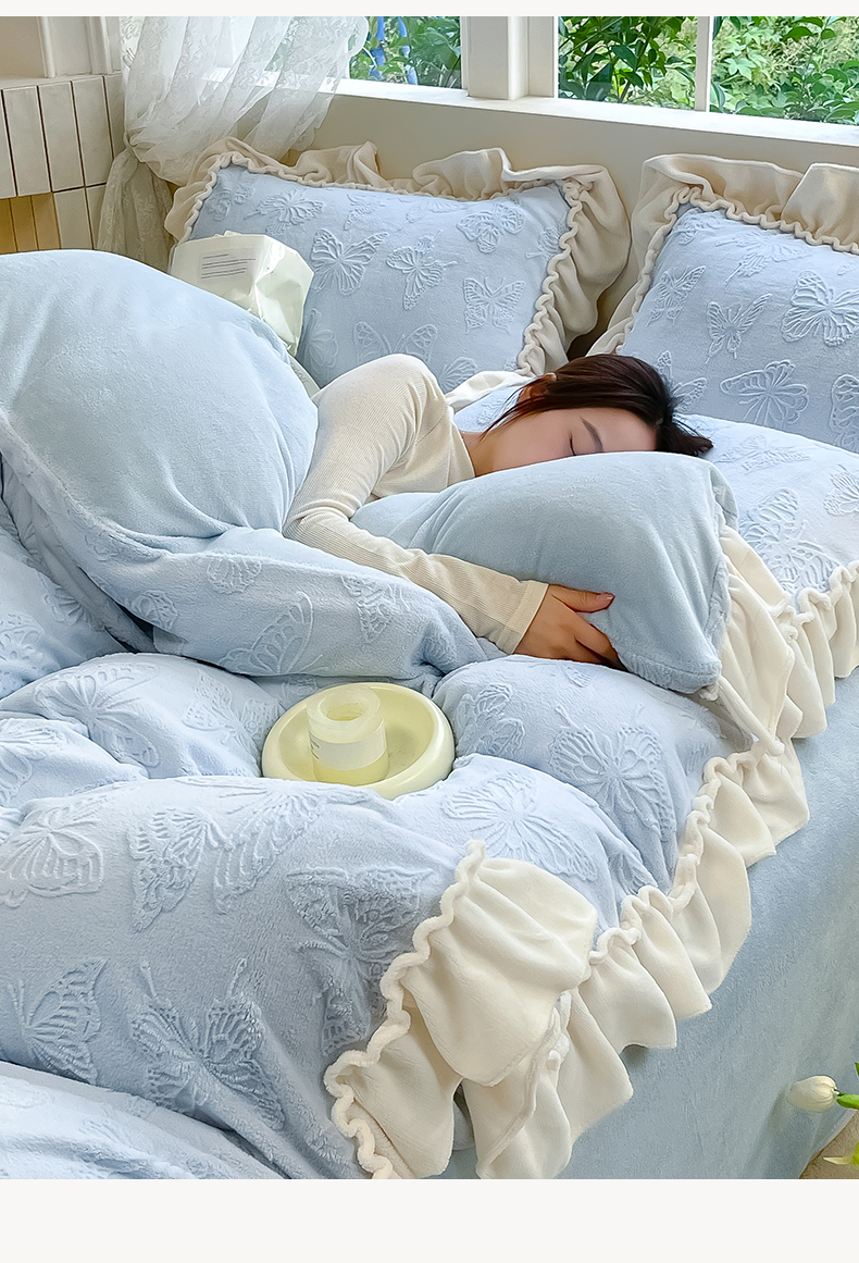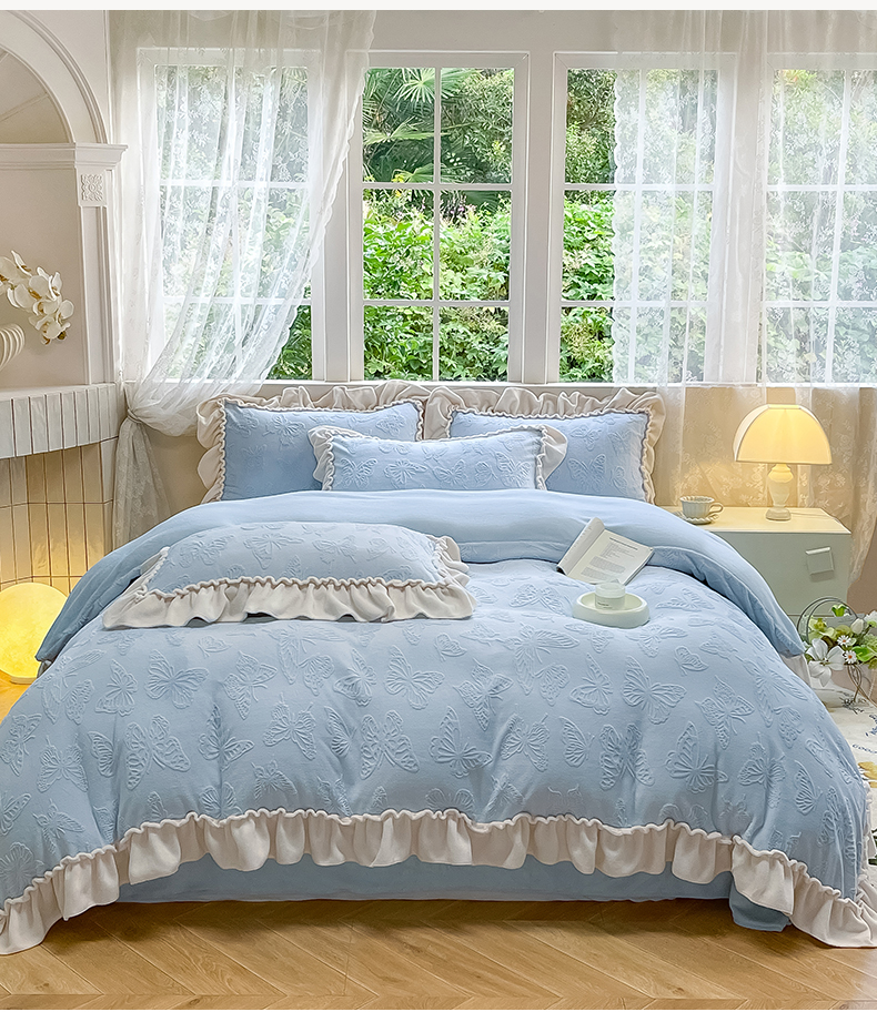 商品名称:水云缦 2025新款牛奶绒木耳边四件套-蝶舞 蝶舞-天空蓝