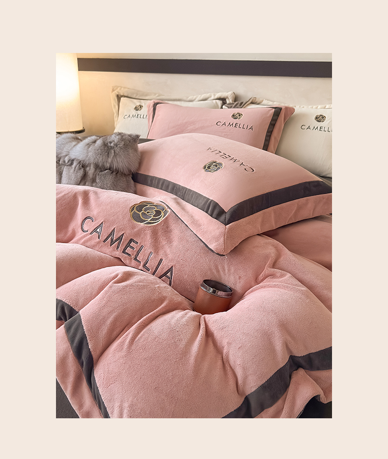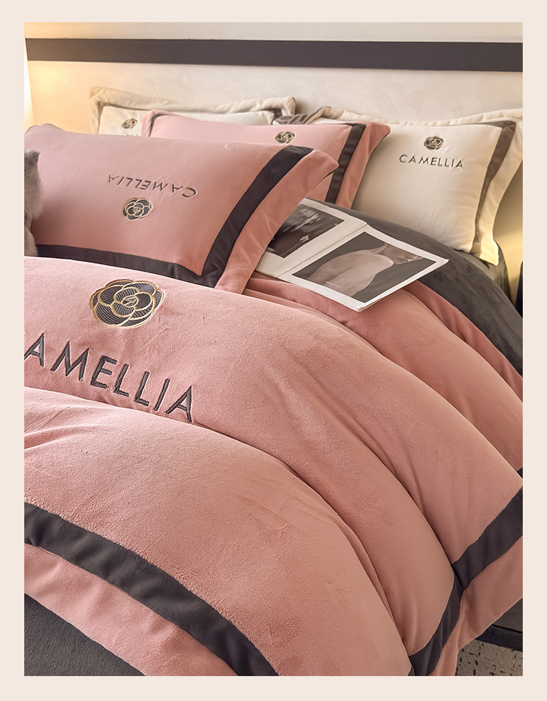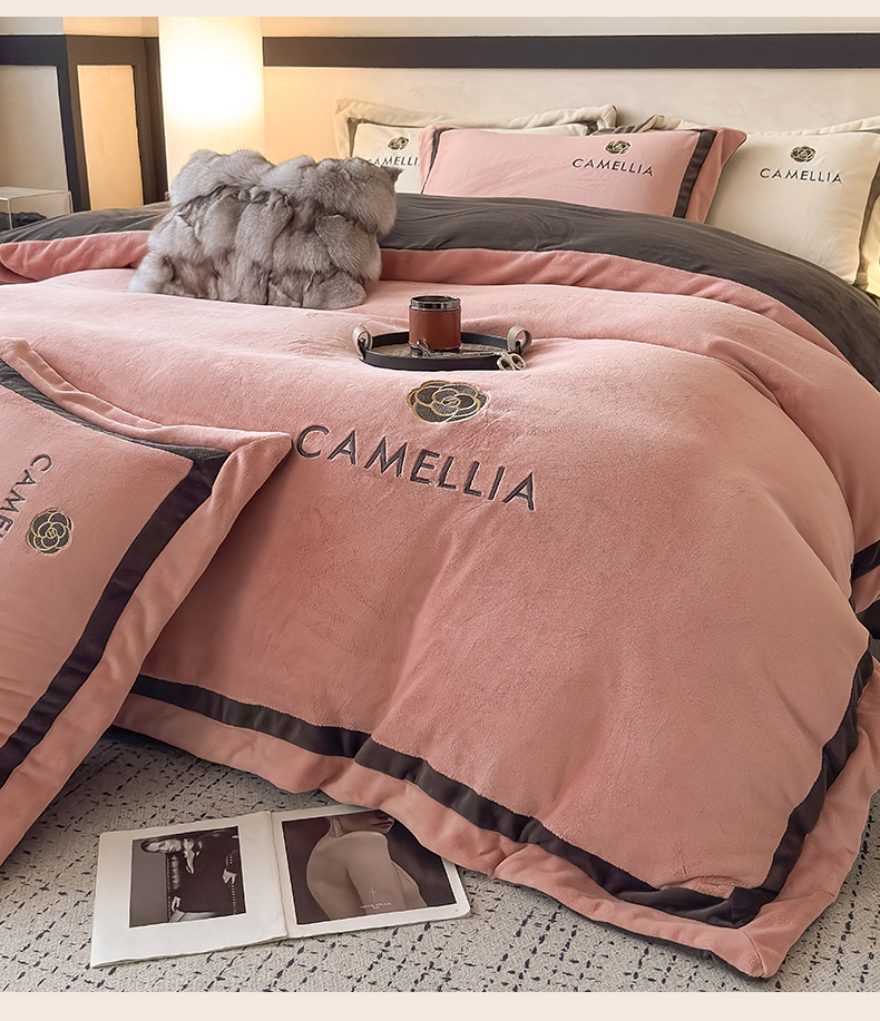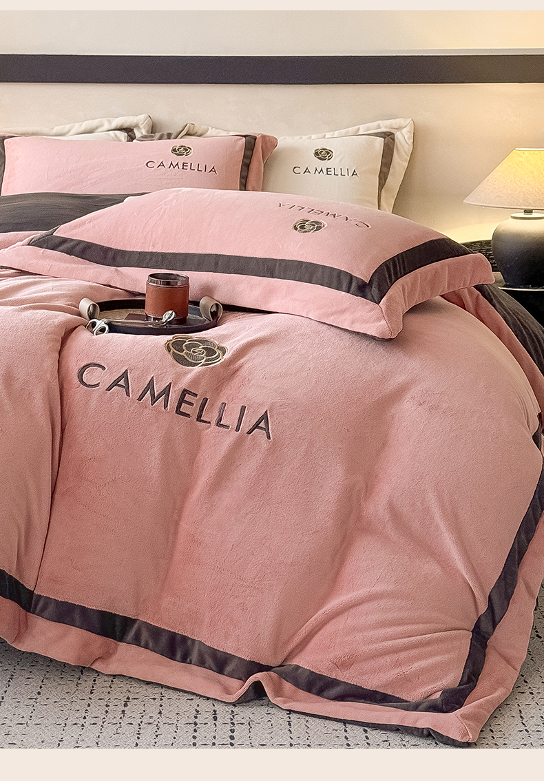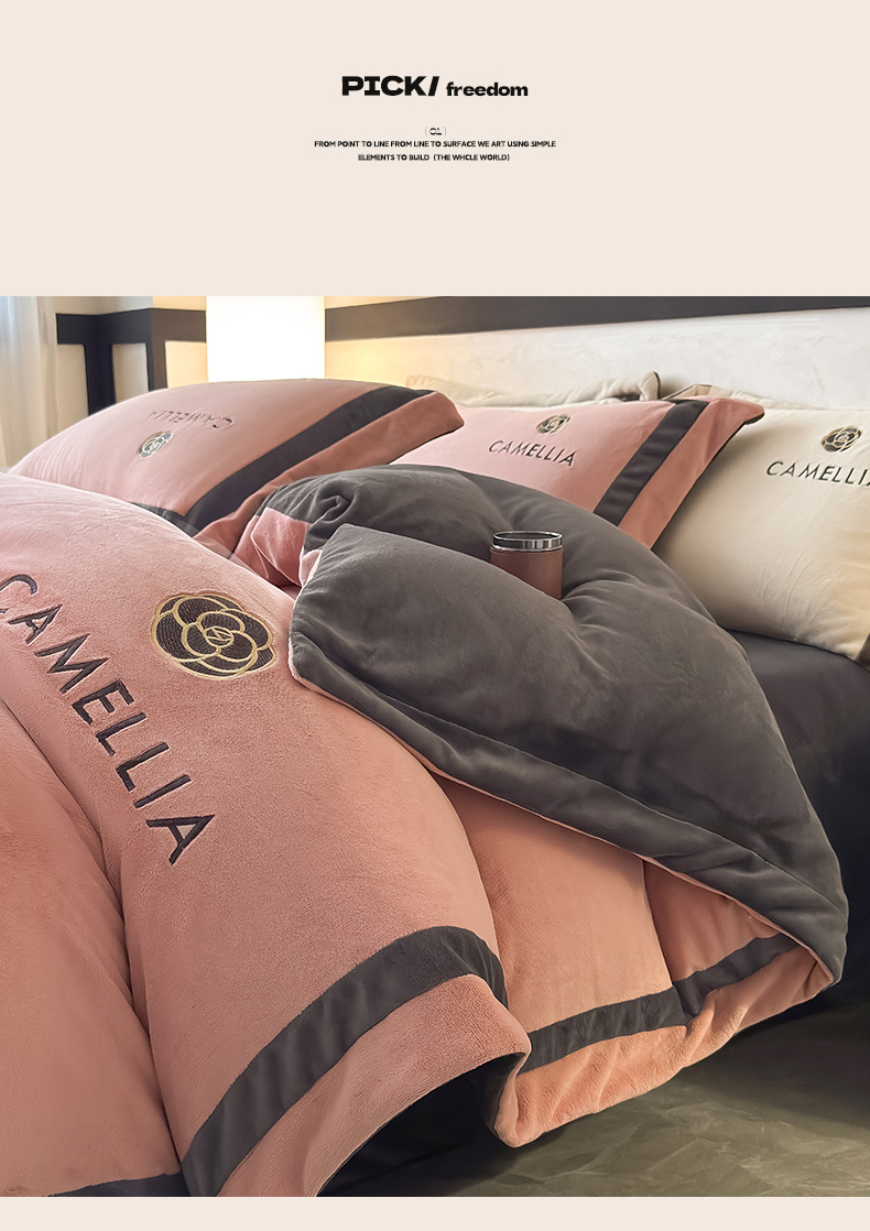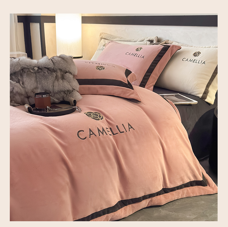 水云缦 2025新款双拼角牛奶绒绣花四件套系列 樱粉-茶褐色