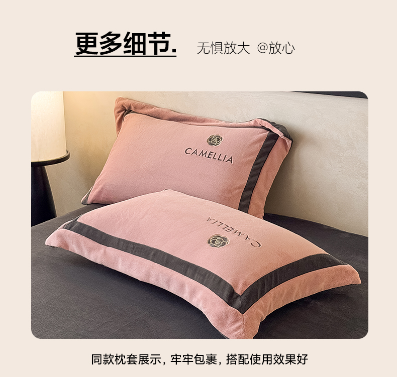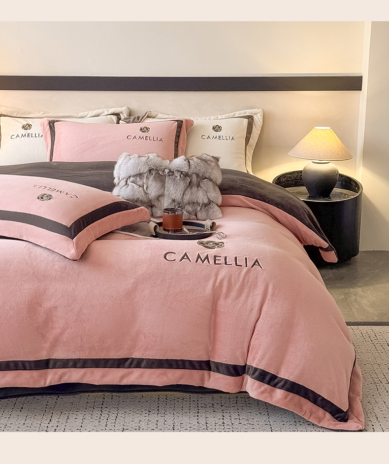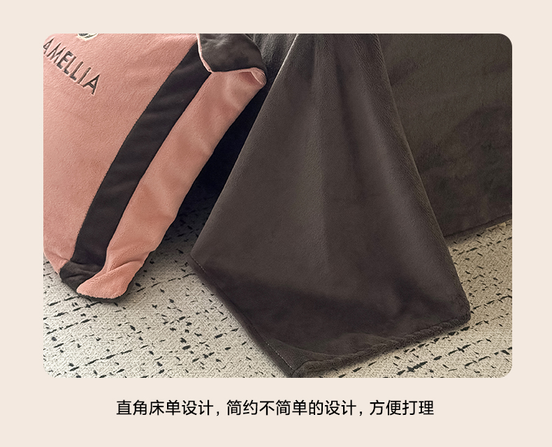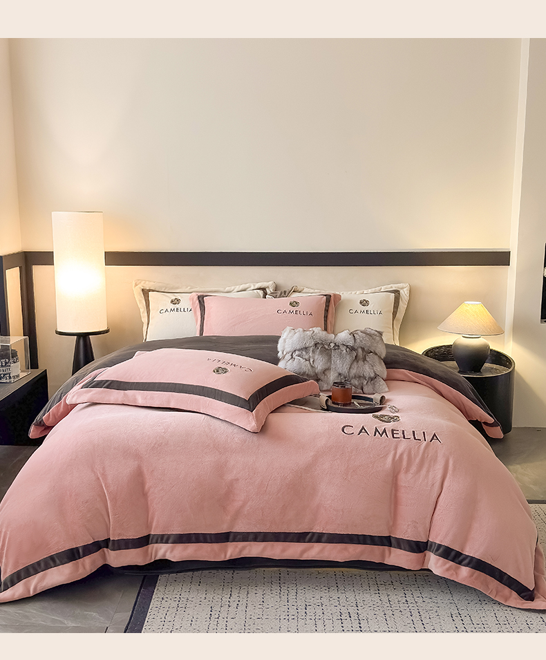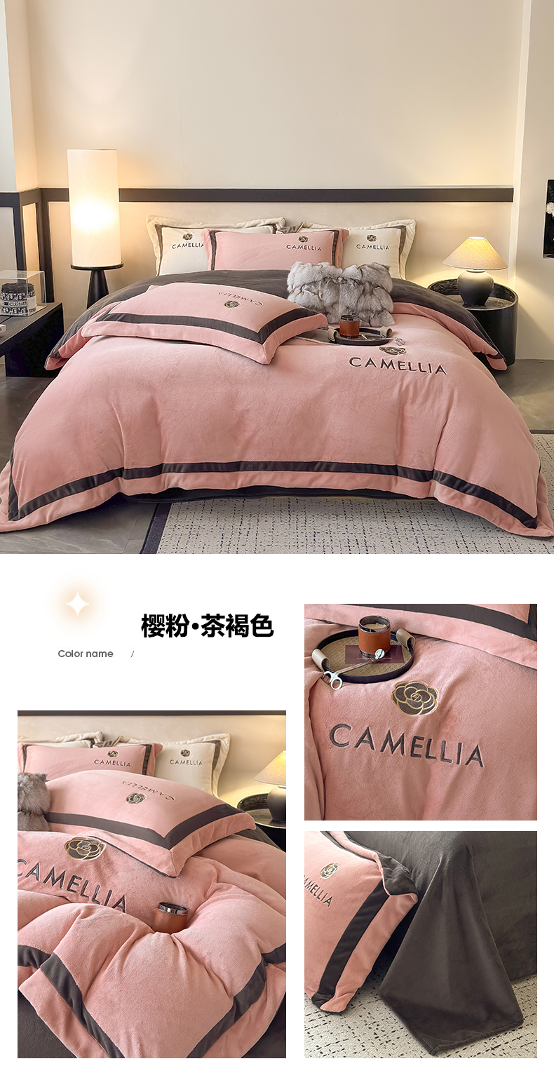 商品名称:水云缦 2025新款双拼角牛奶绒绣花四件套系列 樱粉-茶褐色