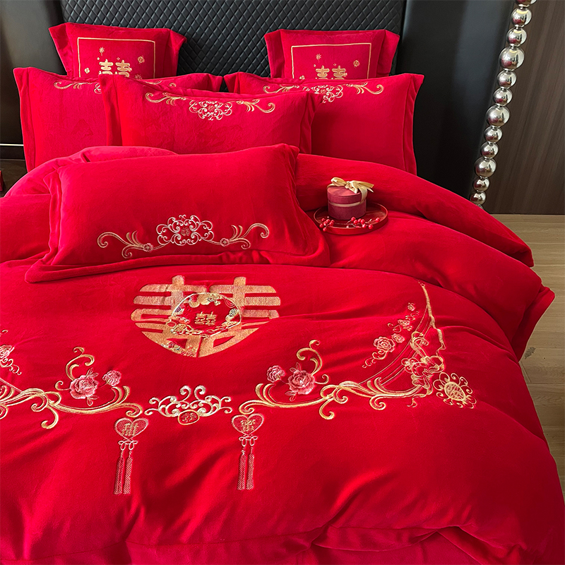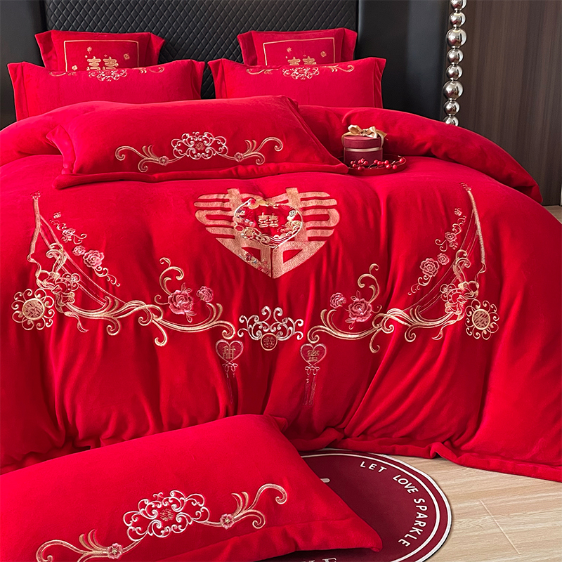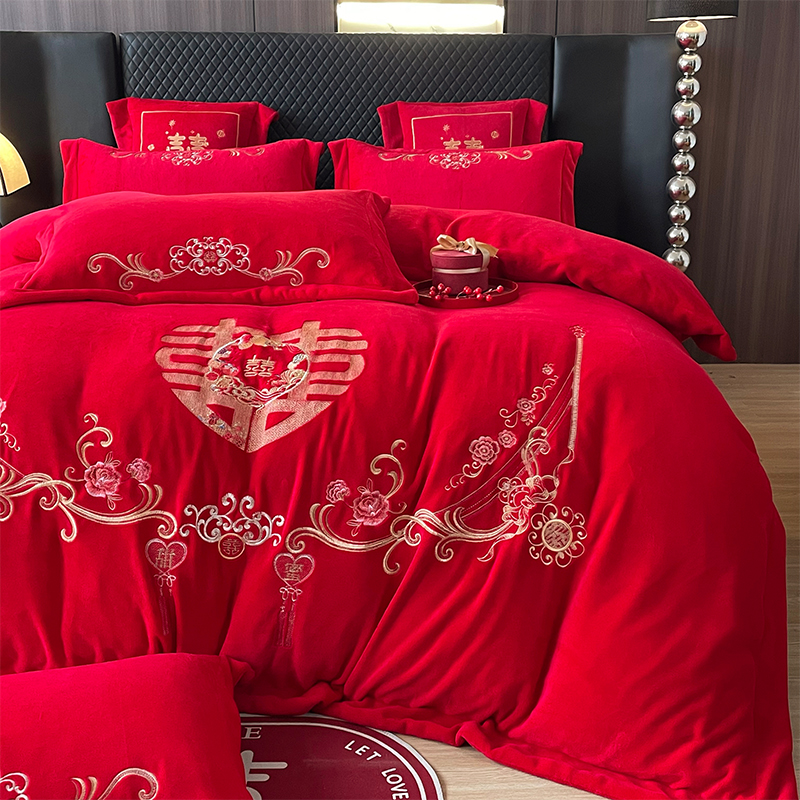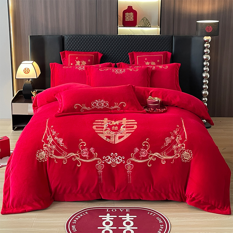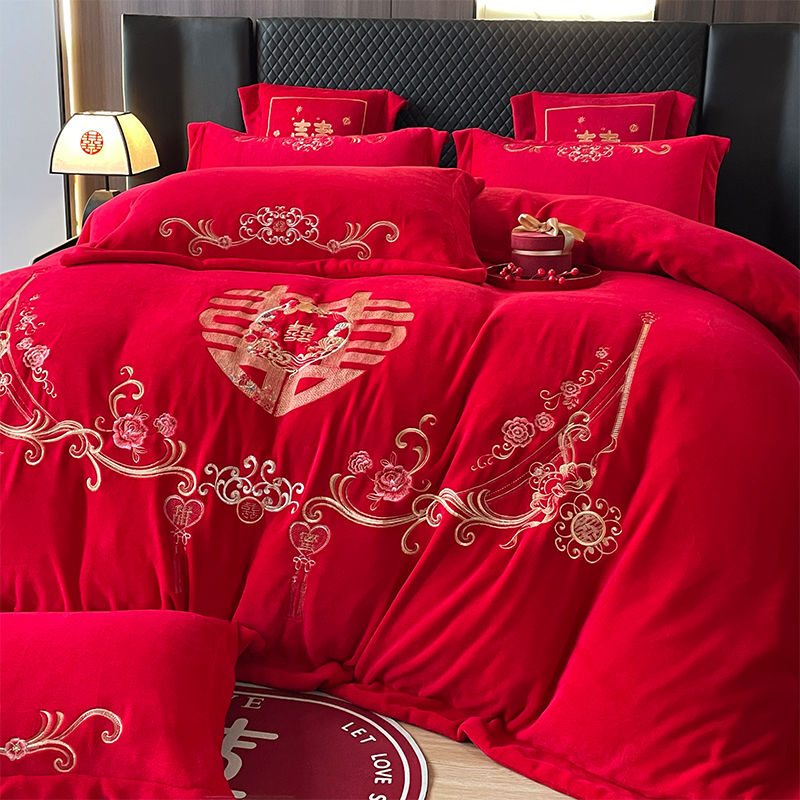 当前位置: 91家纺网 > 商品网购 > 床品套件 > 四件套 > 婚庆四件套 > 羽梦家纺 2025新款全工艺消光牛奶绒绣花婚庆四件套(控价最低368元) 百年同心