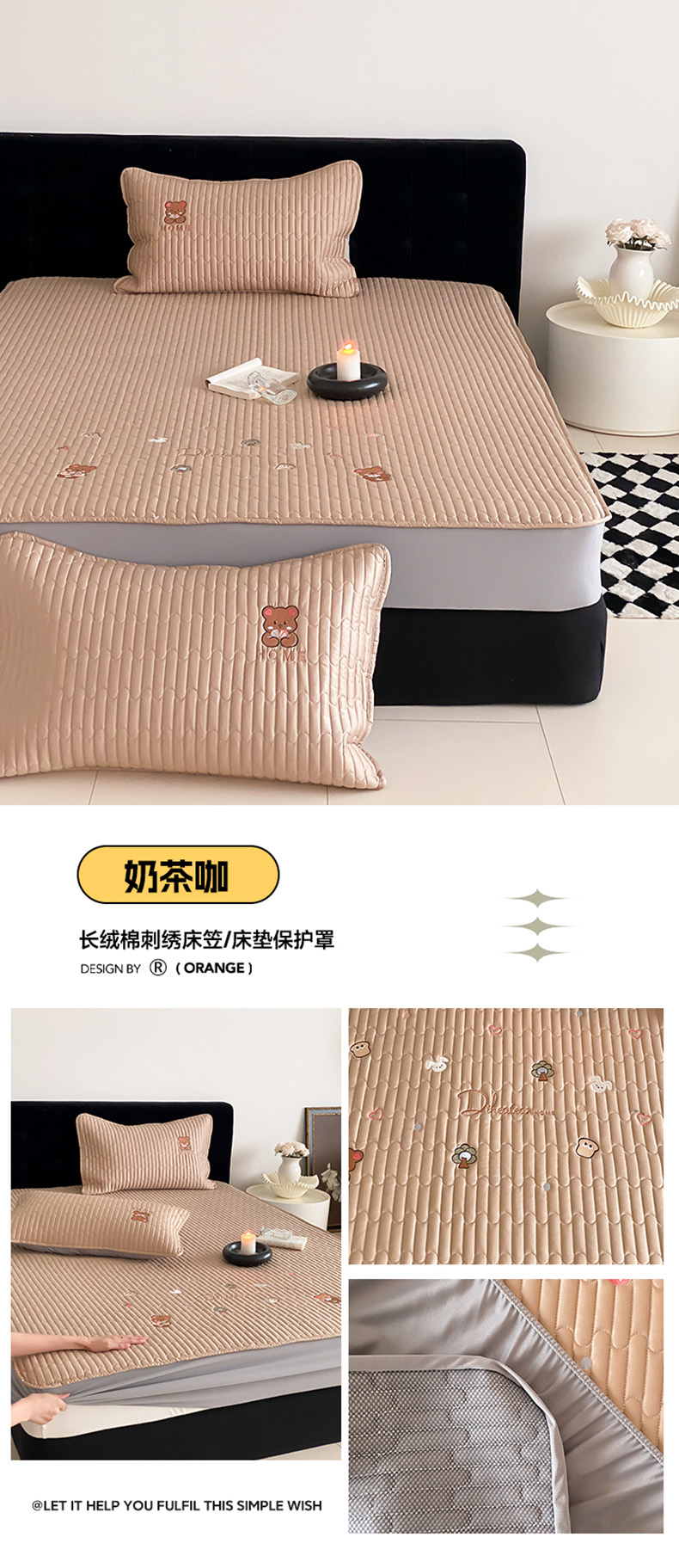 咏绒家纺工厂店 2025新品50S双股全棉长绒棉刺绣绗缝夹棉床笠床垫保护罩三件套 珍珠白