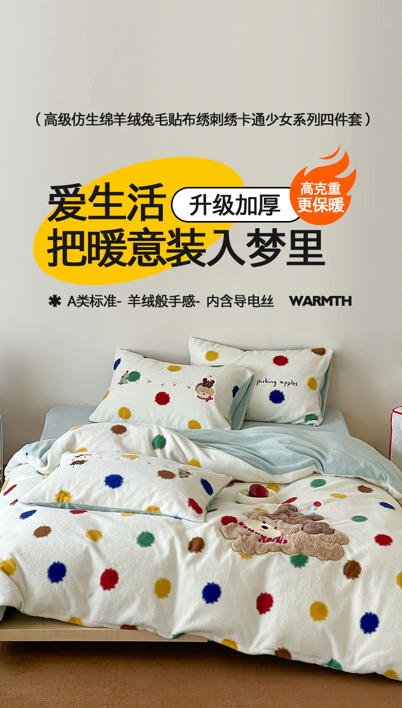桃子家居 2025新款A类高级仿生绵羊绒兔毛贴布绣刺绣工艺卡通少女加厚牛奶绒系列四件套 绵羊绒-狗狗伙伴