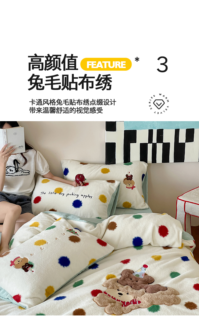 商品名称:桃子家居 2025新款A类高级仿生绵羊绒兔毛贴布绣刺绣工艺卡通少女加厚牛奶绒系列四件套 绵羊绒-狗狗伙伴