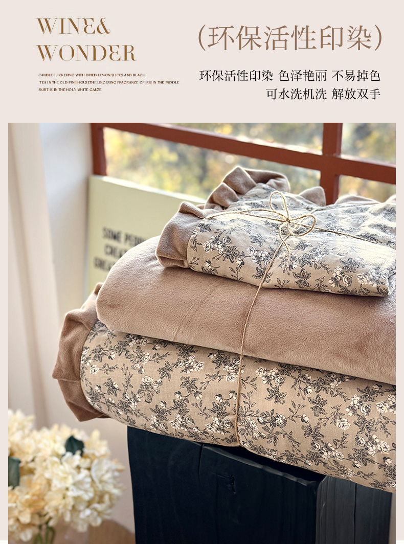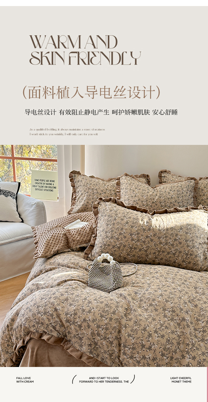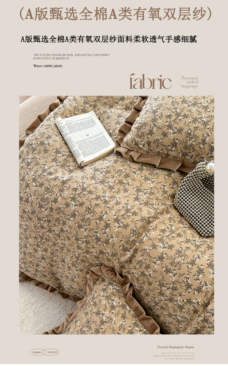 当前位置: 91家纺网 > 商品网购 > 床品套件 > 四件套 > 全棉普通四件套 > 麦伦家居 2025多功能床品全棉纯棉A类有氧双层纱+豆豆绒四件套荷叶边系列 晚秋