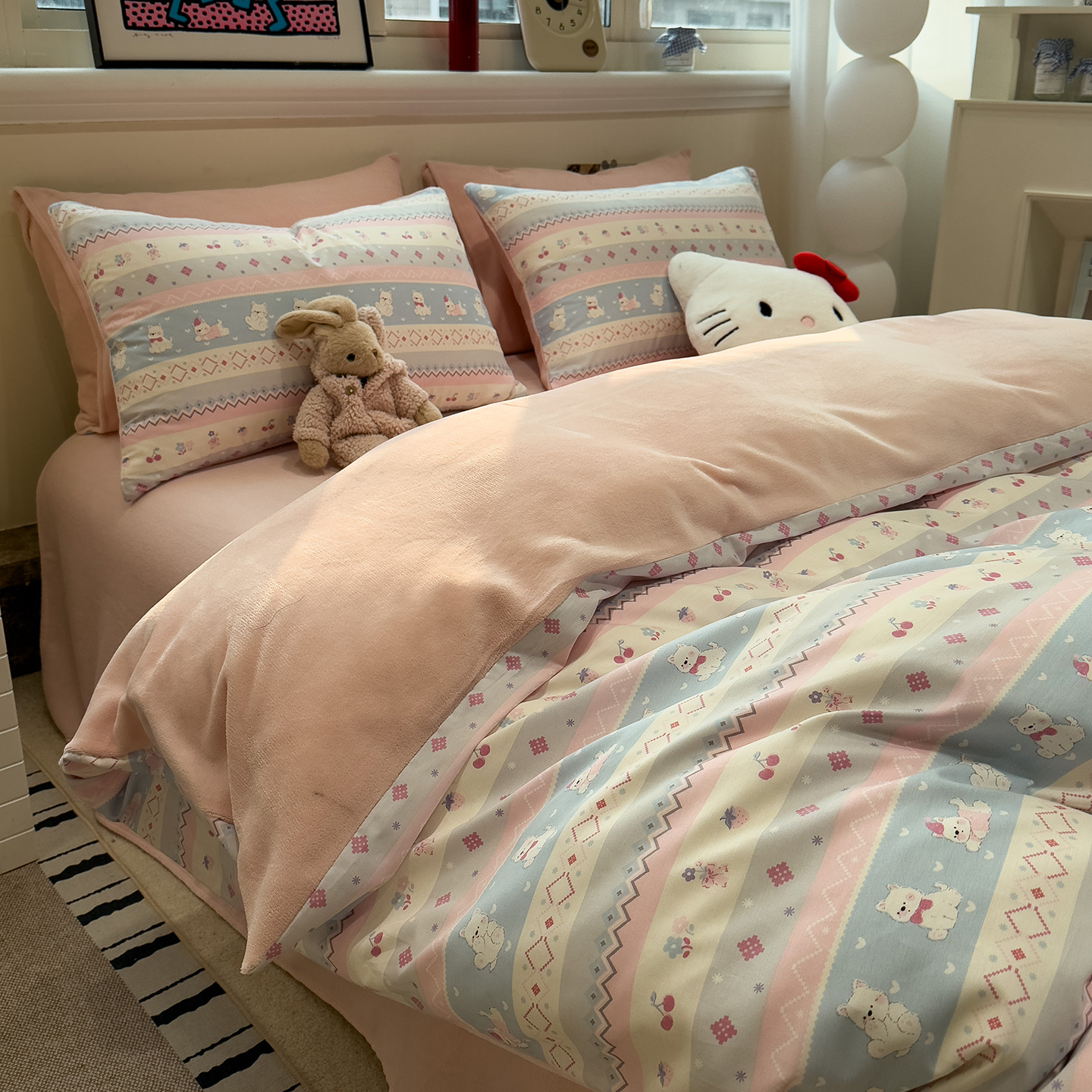 (总)呗旺鹿 2025新款卡通棉+绒牛奶绒棉绒四件套,心意满满,快乐魔法,闹钟麦田