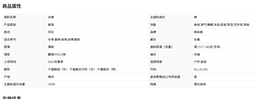 [{"sp_id":11,"sp_name":"\u989c\u8272\u5206\u7c7b","sp_format":2,"sp_list":[{"sp_value_id":1650,"sp_value_name":"\u7ea2\u8272","sp_value_image":{"id":999,"path":"https:\/\/img3.91jf.com\/ghelp\/2025\/20251212\/20251212161333_659190.jpg"},"sp_value_video":{"id":0,"img":"","path":"","time":0,"download_num":0,"play_num":0},"price":"69.00","storage":100,"weight":"1.500","is_check_weight":0,"plus_price":"","sp_sort":0},{"sp_value_id":1651,"sp_value_name":"\u7070\u8272","sp_value_image":{"id":999,"path":"https:\/\/img3.91jf.com\/ghelp\/2025\/20251212\/20251212161335_598249.jpg"},"sp_value_video":{"id":0,"img":"","path":"","time":0,"download_num":0,"play_num":0},"price":"69.00","storage":100,"weight":"1.500","is_check_weight":0,"plus_price":"","sp_sort":0},{"sp_value_id":1652,"sp_value_name":"\u7eff\u8272","sp_value_image":{"id":999,"path":"https:\/\/img3.91jf.com\/ghelp\/2025\/20251212\/20251212161340_713760.jpg"},"sp_value_video":{"id":0,"img":"","path":"","time":0,"download_num":0,"play_num":0},"price":"69.00","storage":100,"weight":"1.500","is_check_weight":0,"plus_price":"","sp_sort":0}]},{"sp_id":9,"sp_name":"\u5c3a\u7801","sp_format":1,"sp_list":[{"sp_value_id":36,"sp_value_name":"\u5bb6\u5c45\u670d","sp_value_image":{"id":0,"path":""},"sp_value_video":{"id":0,"img":"","path":"","time":0,"download_num":0,"play_num":0},"price":"69.00","storage":100,"weight":"1.500","is_check_weight":0,"plus_price":"","sp_sort":0}]}]