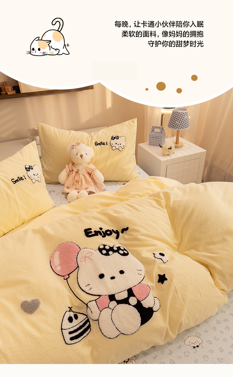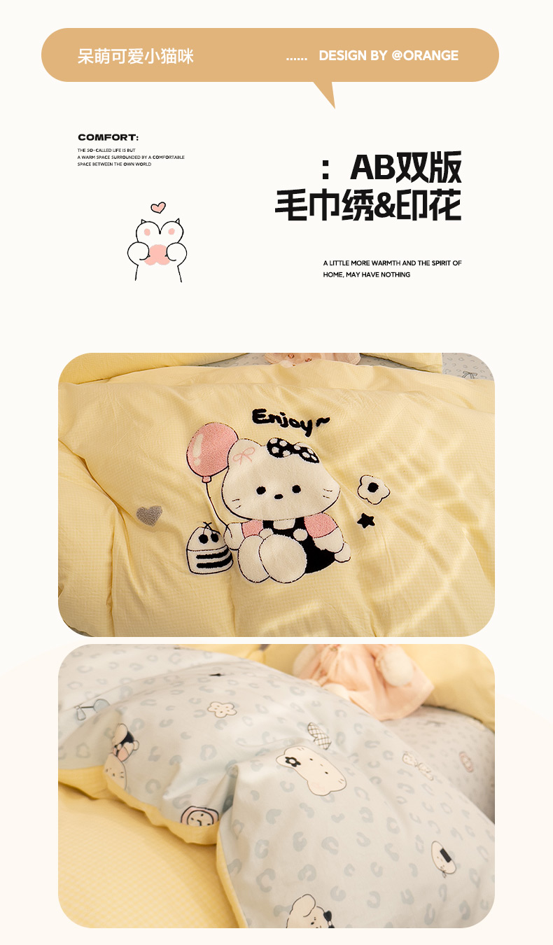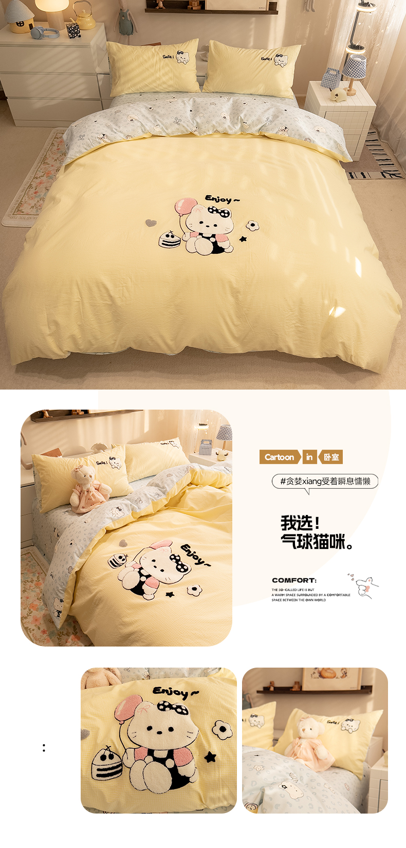 雅居纺家纺 2026新款全棉色织水洗棉毛巾绣猫咪四件套 气球猫咪