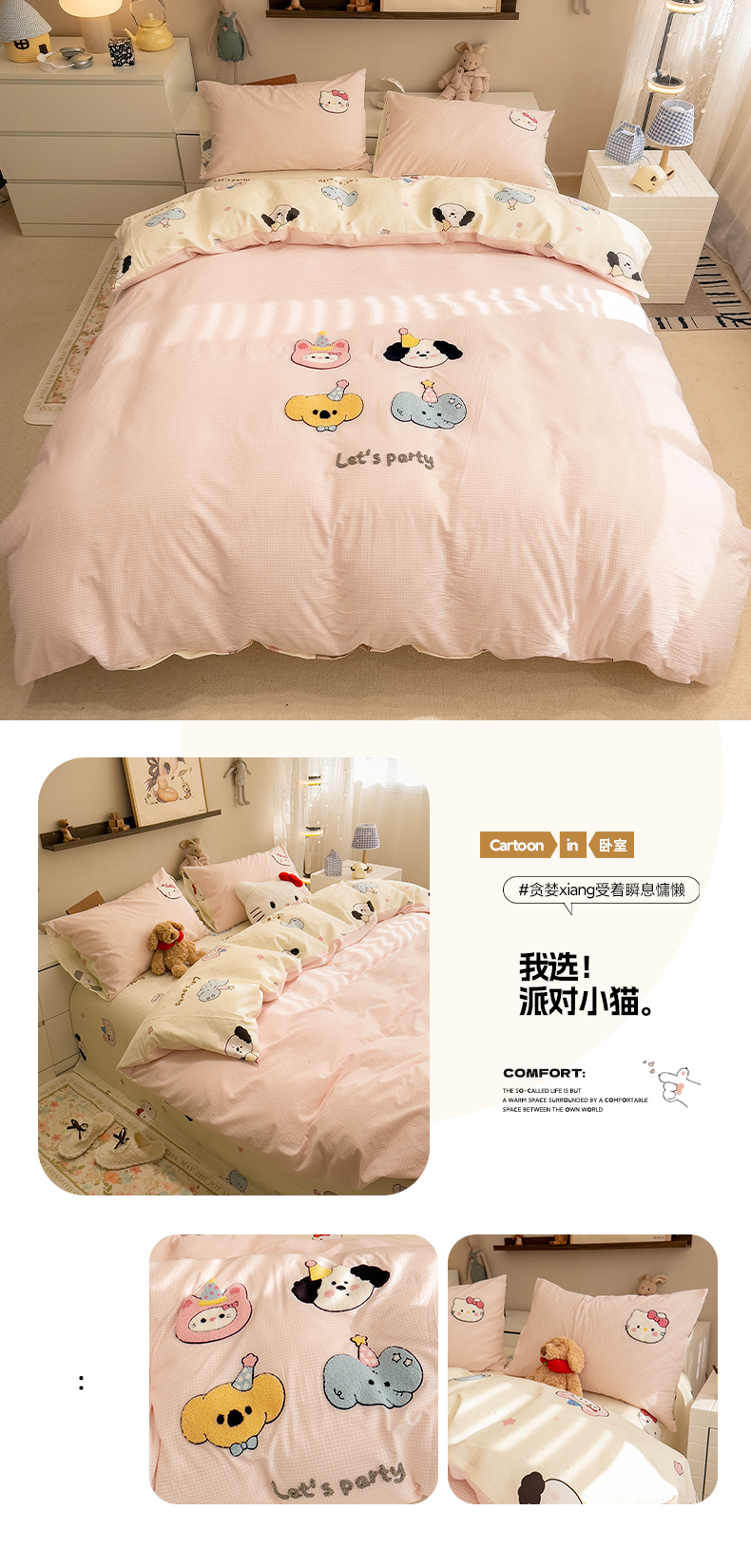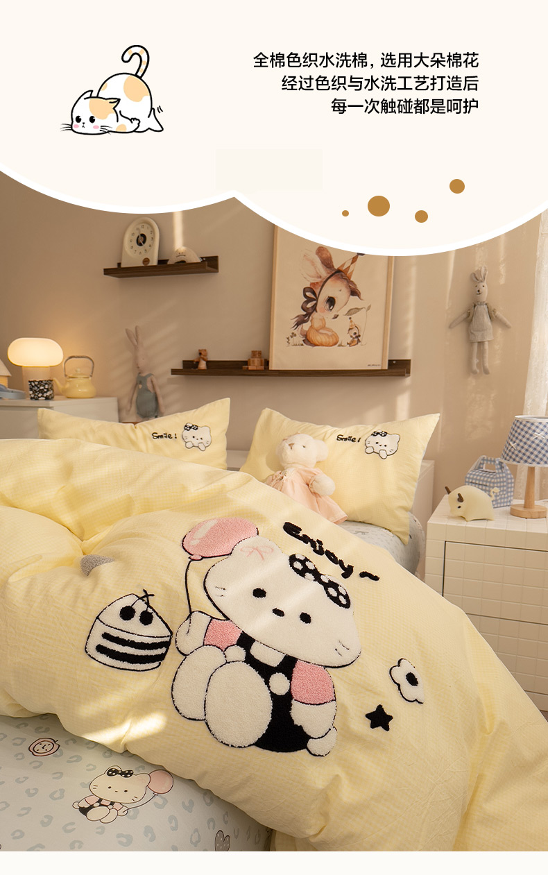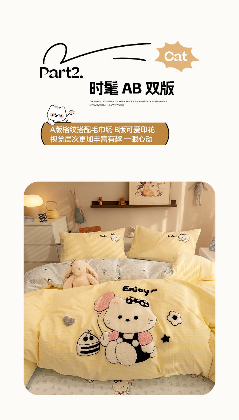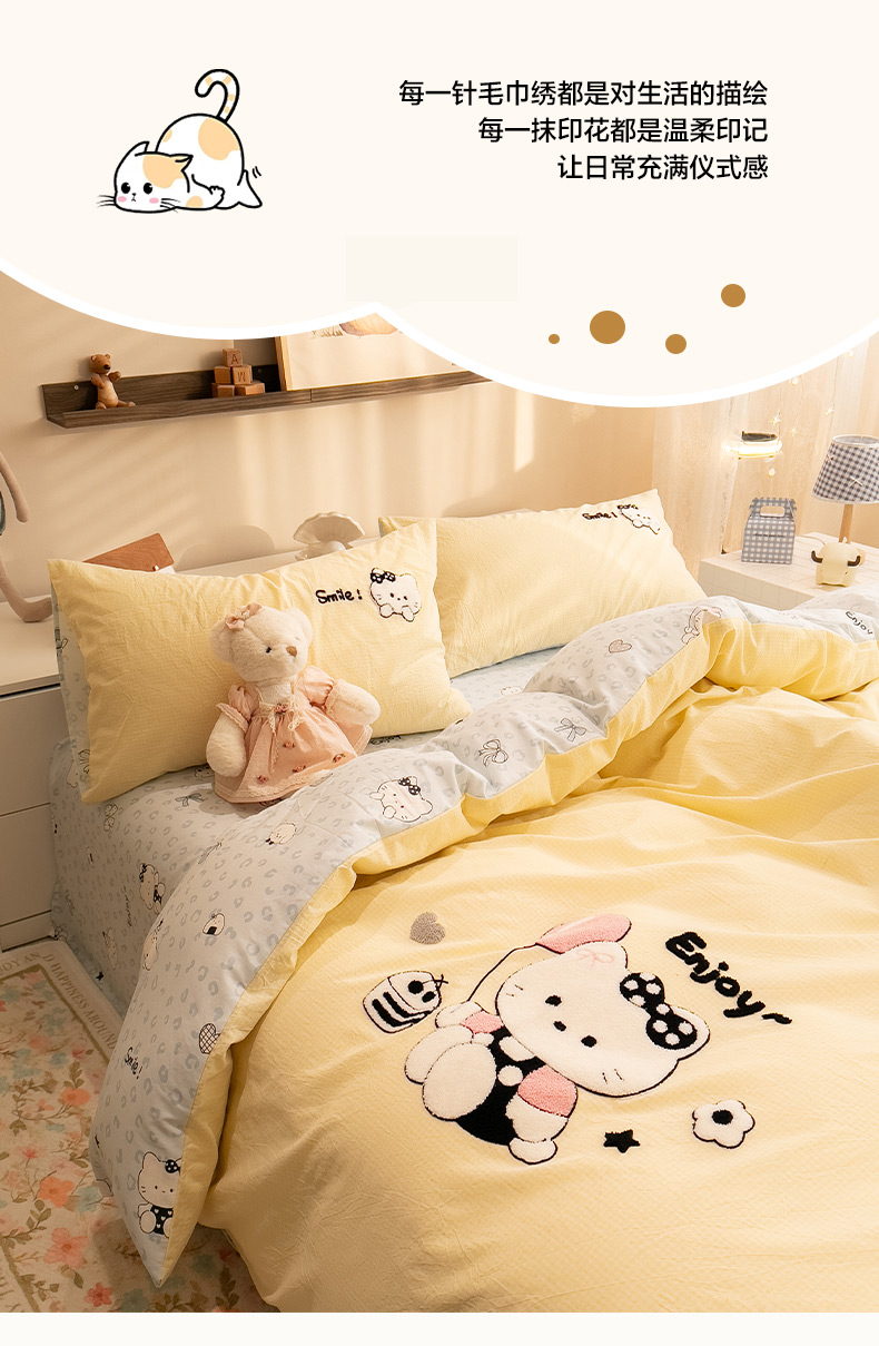 (总)雅居纺家纺 2026新款全棉双层纱毛巾绣四件套,蛋糕猫咪,红苹果小狗,萌宠甜品,早安兔兔