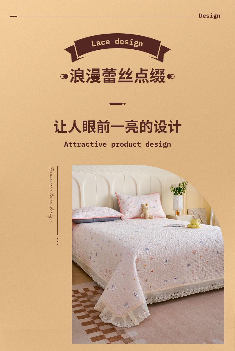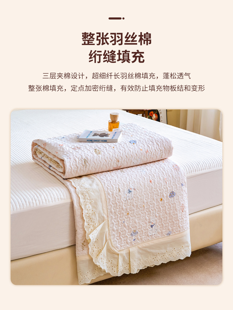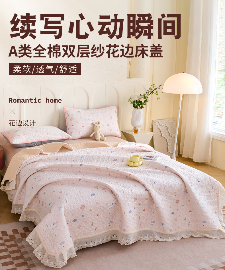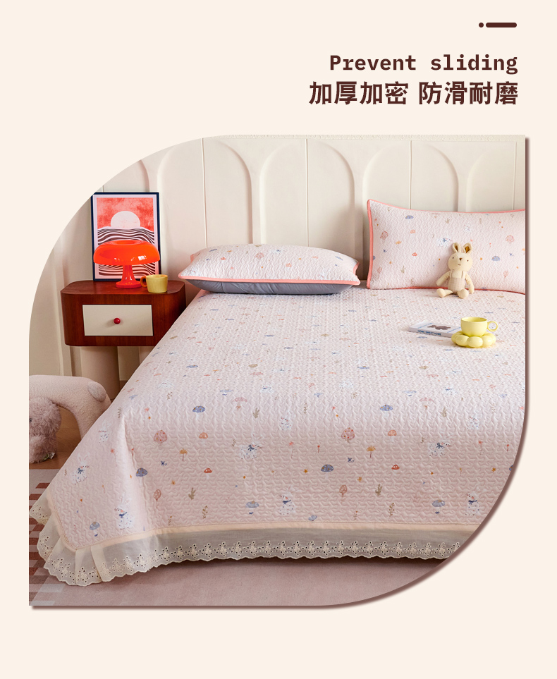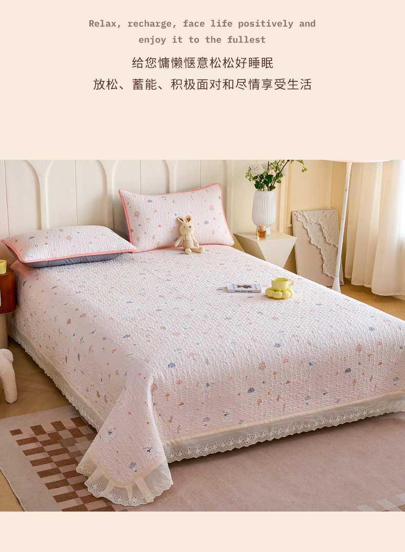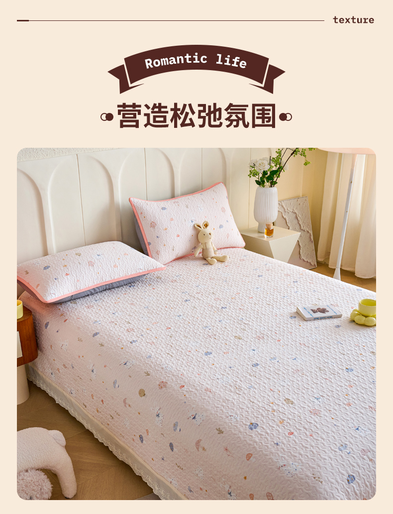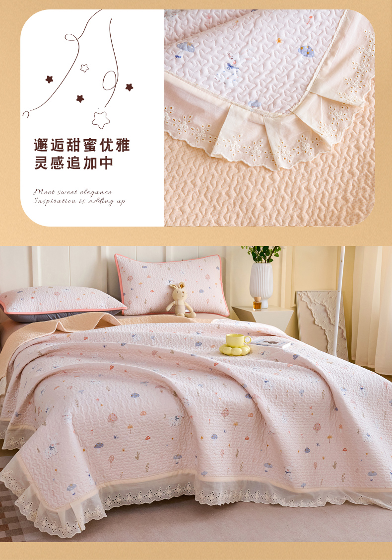 • 91家纺网 家纺一手货源 找家纺 拾小柒 2026年新款全棉双层纱床盖花边法式中古奶油风防滑床盖三件套 萌趣森林粉
