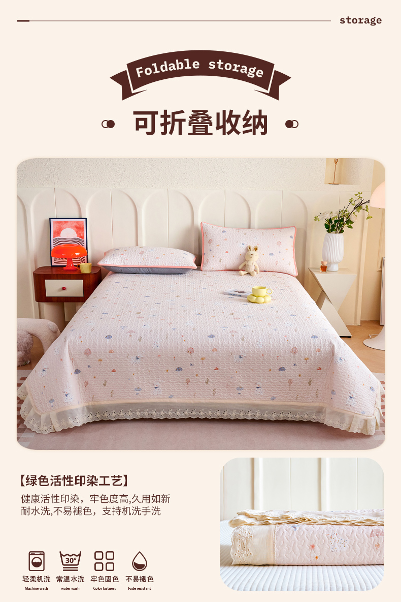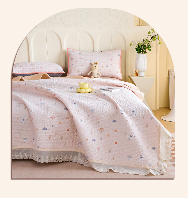 当前位置: 91家纺网 > 商品网购 > 床上用品 > 床盖 > 拾小柒 2026年新款全棉双层纱床盖花边法式中古奶油风防滑床盖三件套 萌趣森林粉