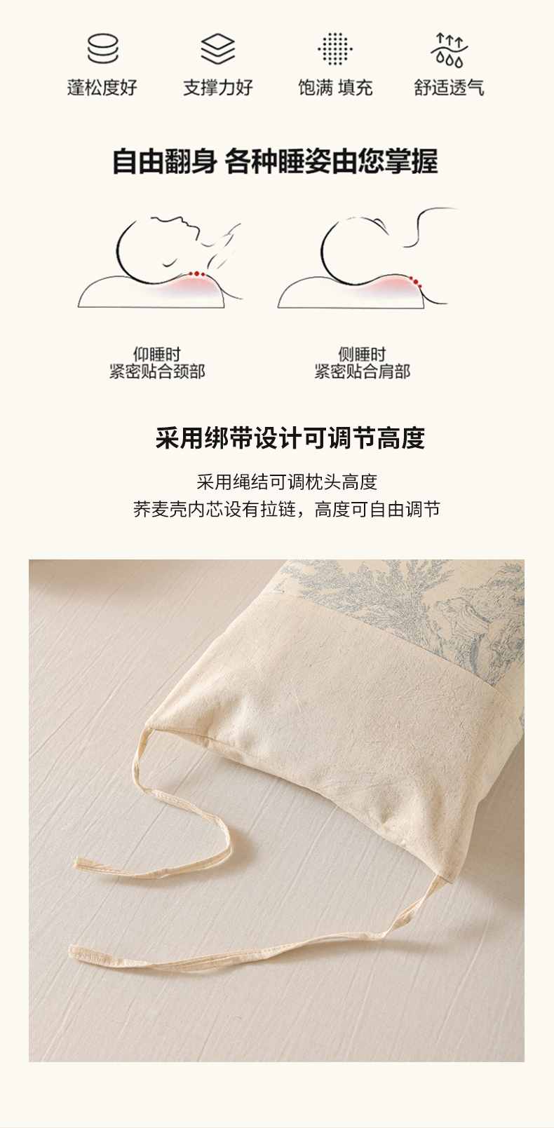 当前位置: 91家纺网 > 商品网购 > 枕头/枕芯/保健枕/颈椎枕 > 枕头枕芯 > 仁宇枕业 2026新款棉麻古朴两用绑带款系列荞麦枕枕头枕芯 棉麻款两用绑带系列荞麦枕-春意蓝色