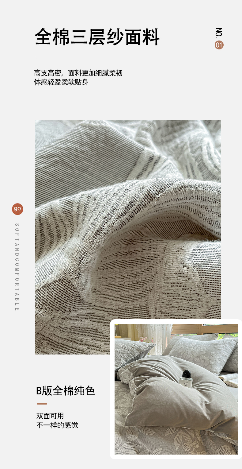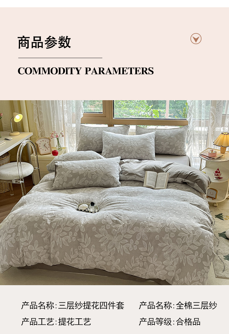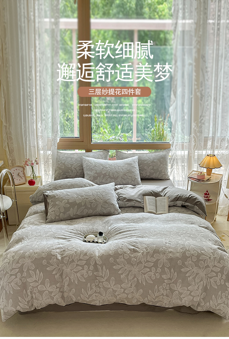 当前位置: 91家纺网 > 商品网购 > 床品套件 > 四件套 > 全棉普通四件套 > 琪格格纺织 2026新款60s纯棉加厚三层纱系列四件套 三层纱 爱在春秋-灰