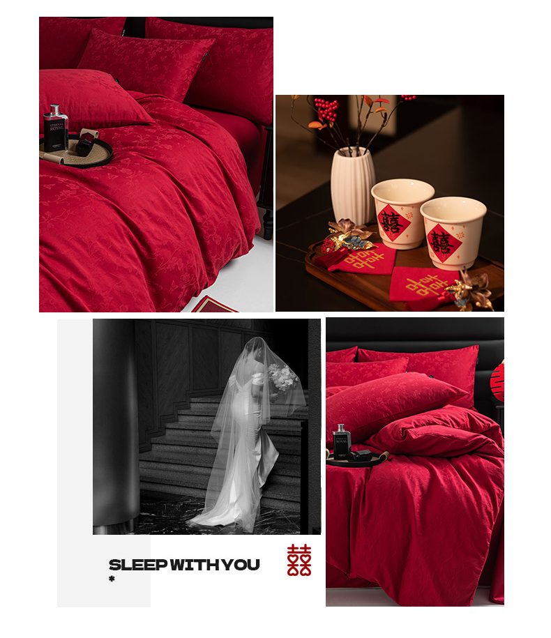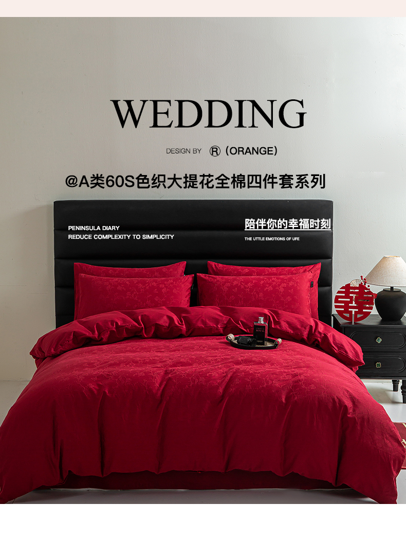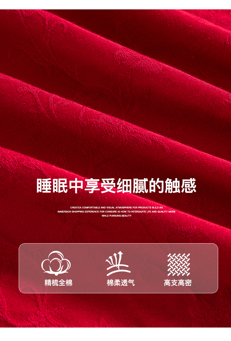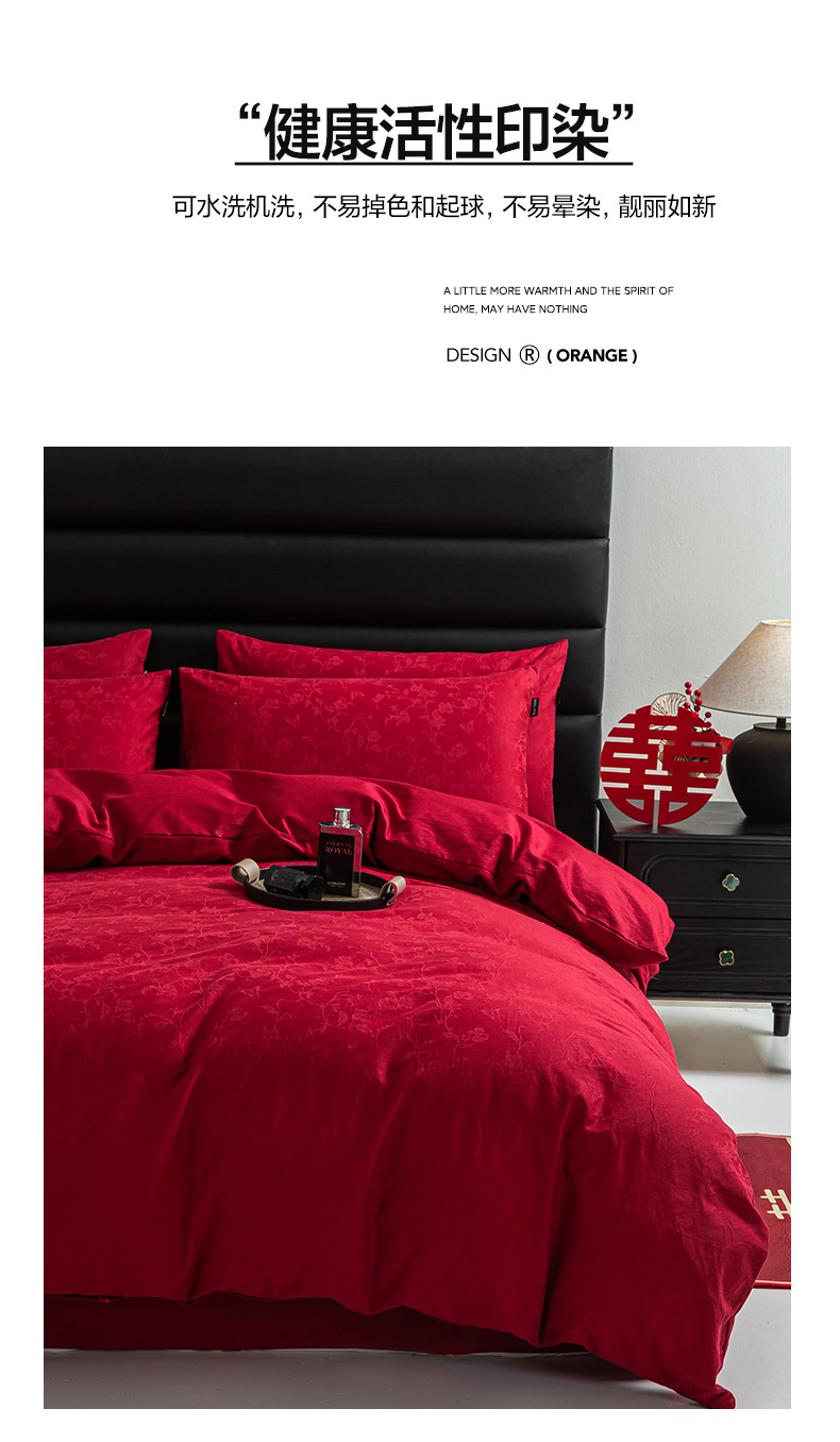 卧趣家纺 2026新款全棉贡缎提花红色婚庆纯棉四件套 露柯