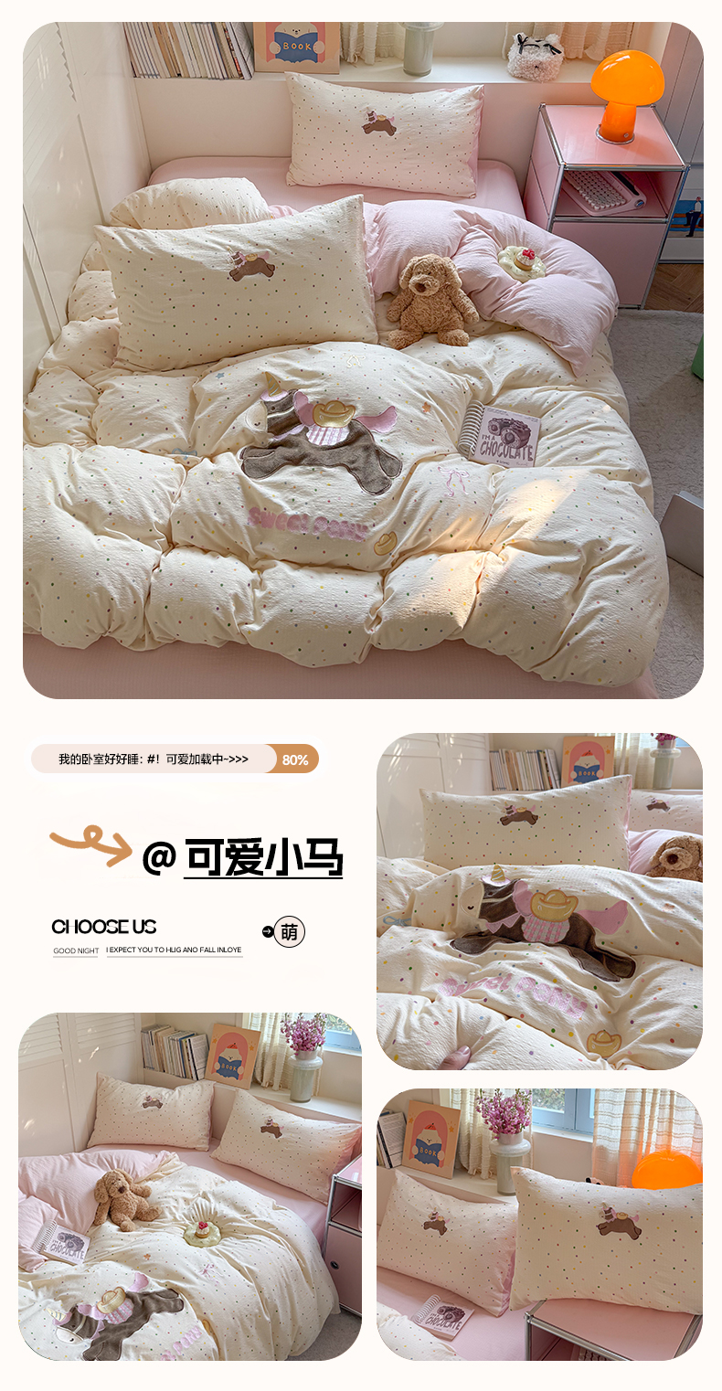 (总)美乐迪家纺 2026新款贴布绣云感双层纱四件套,大象,可爱小马,比熊,布偶猫,躲猫猫,头套小猫