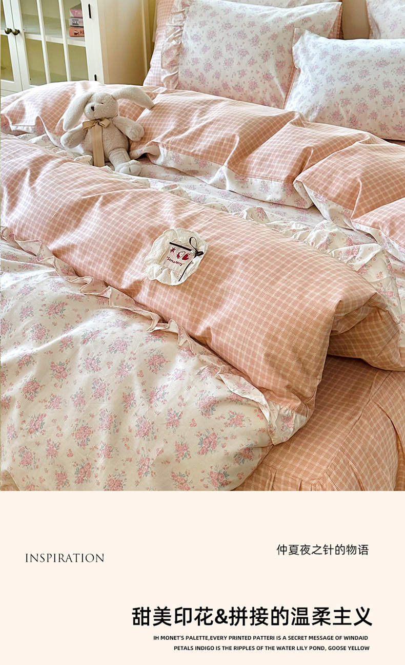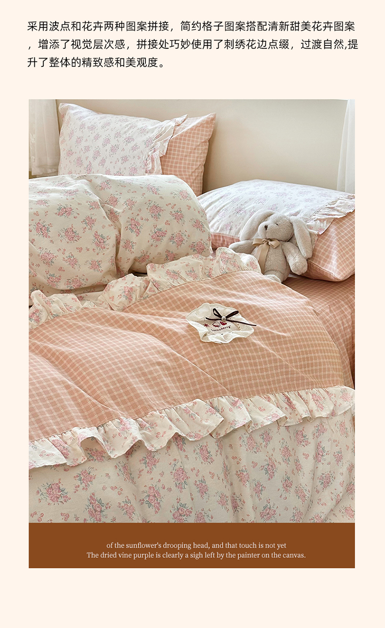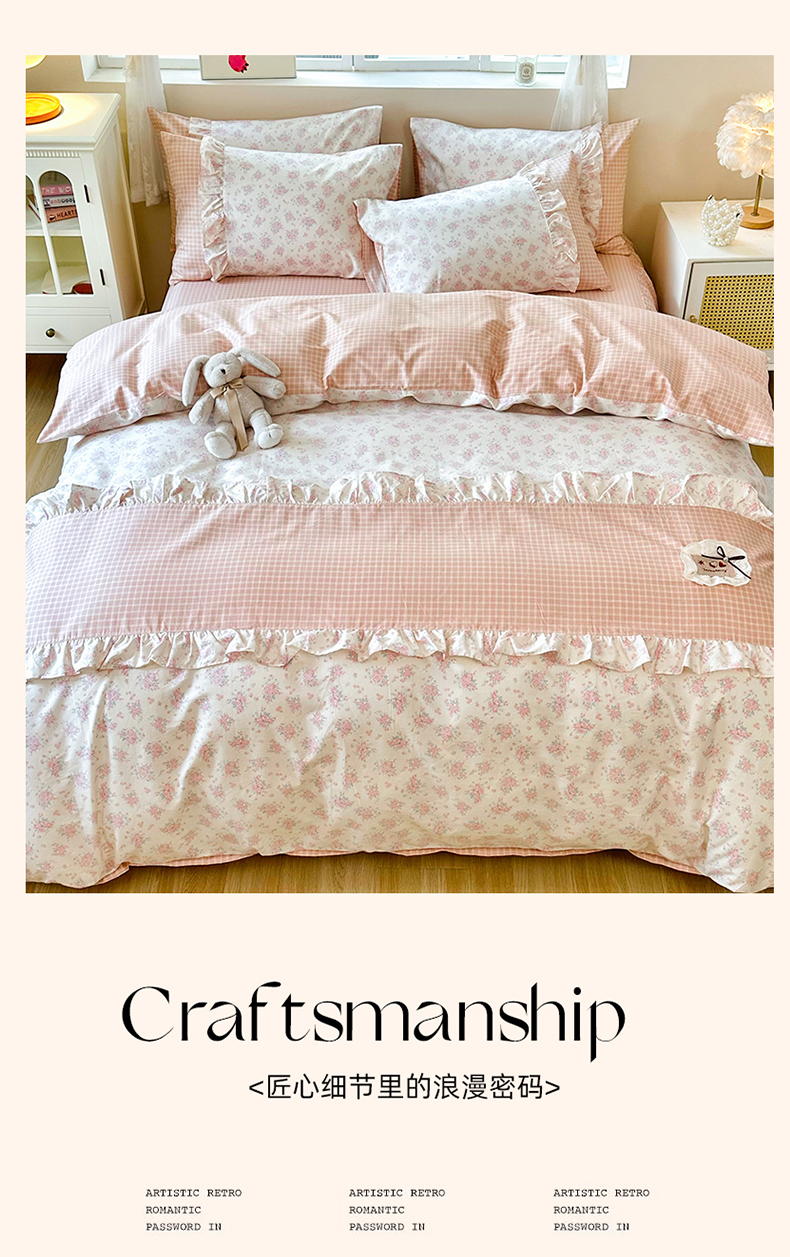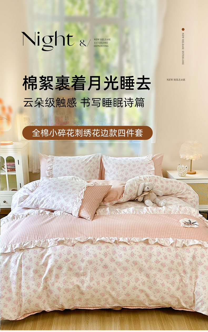 商品名称:玉元坊 2026新款全棉纯棉小碎花刺绣花边款四件套田园公主风系列 柔情花梦粉