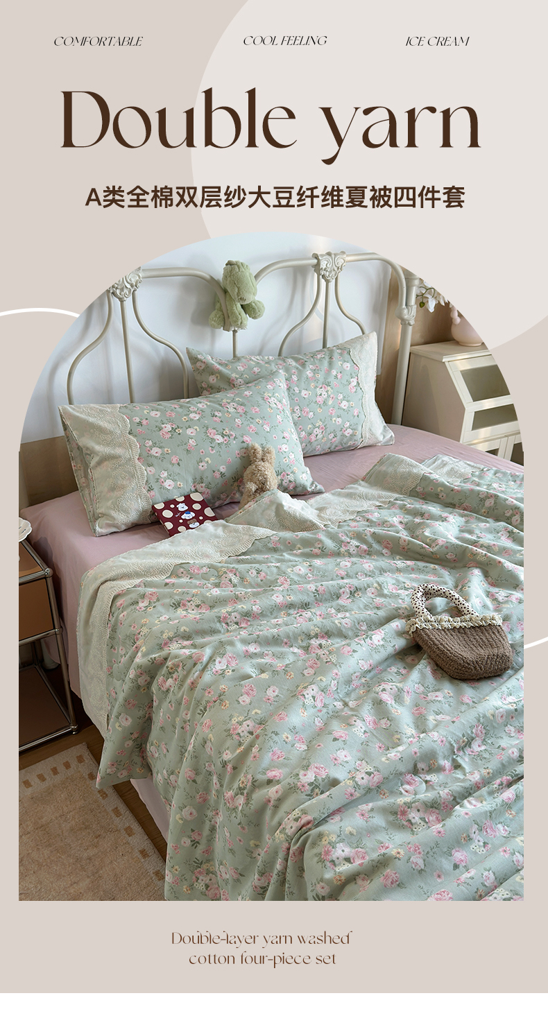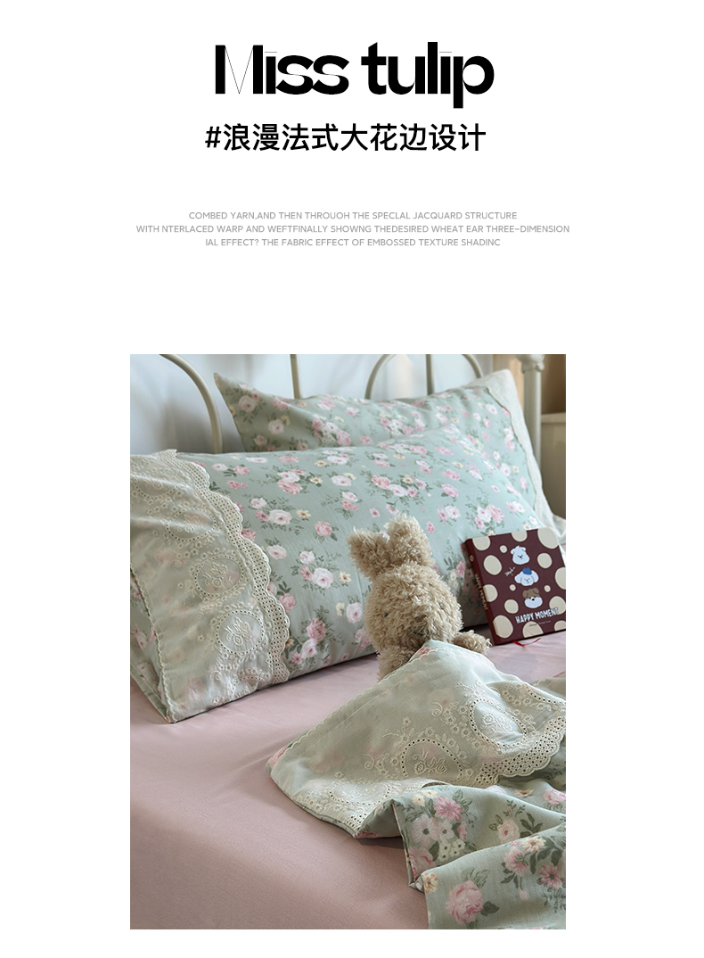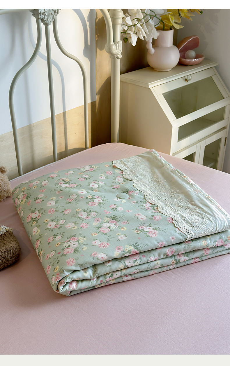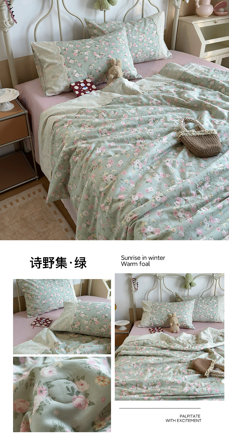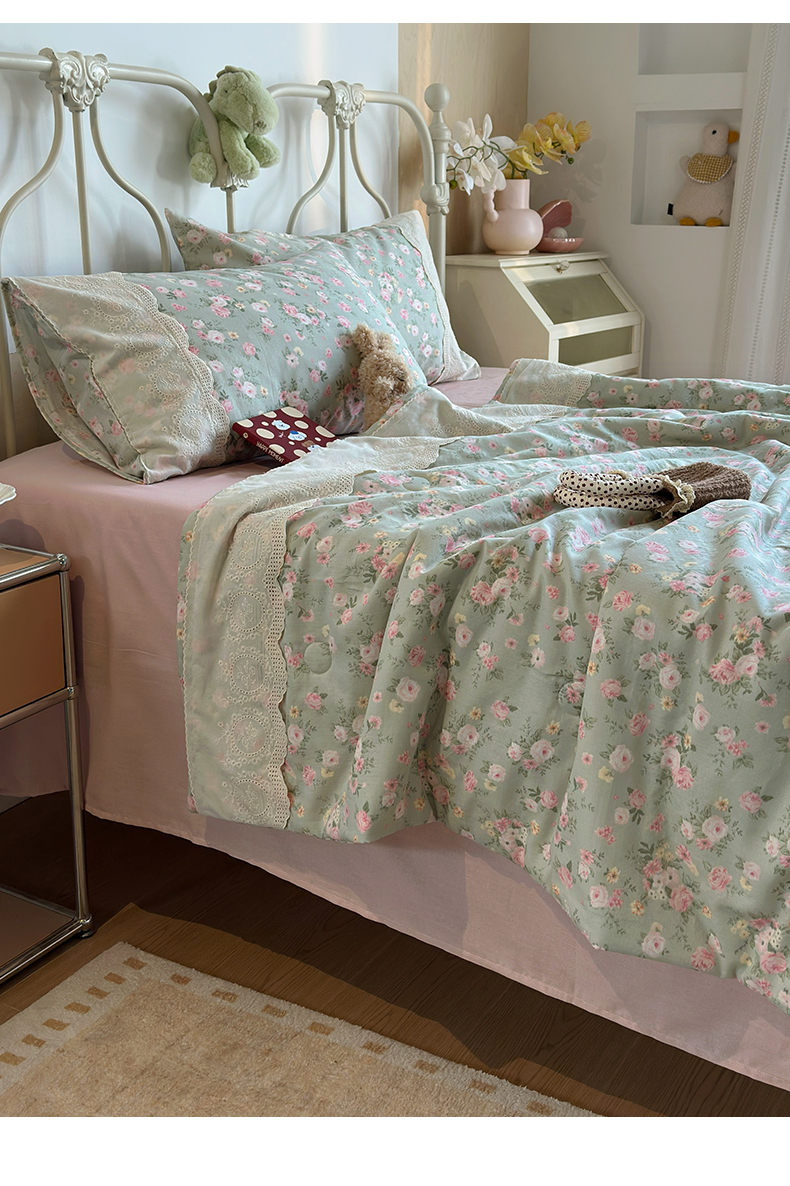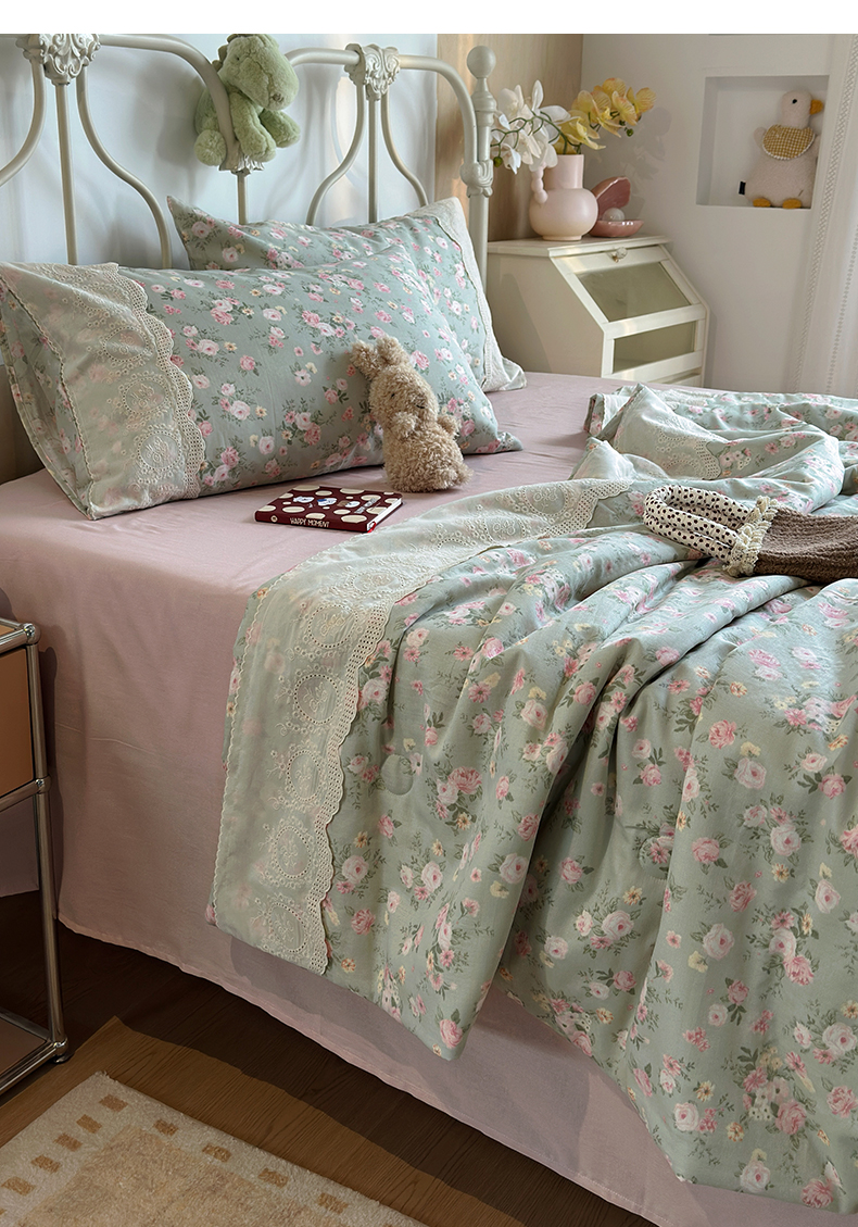 当前位置: 91家纺网 > 商品网购 > 床品套件 > 四件套 > 夏被四件套 > 绫韵家纺 2026夏季新品A类全棉双层纱法式大花边夏被四件套 诗野集·绿