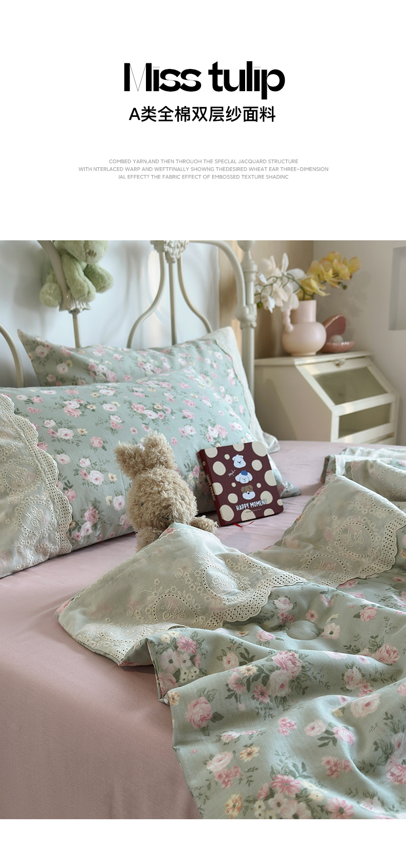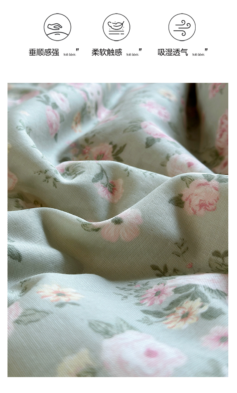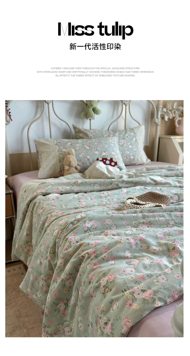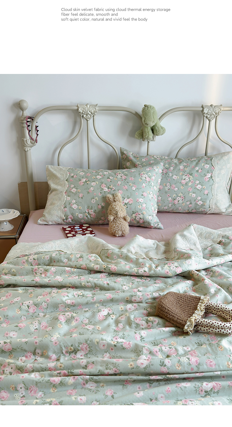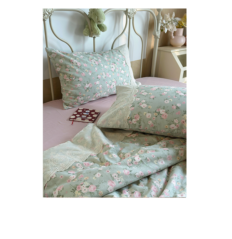 当前位置: 91家纺网 > 商品网购 > 床品套件 > 四件套 > 夏被四件套 > 绫韵家纺 2026夏季新品A类全棉双层纱法式大花边夏被四件套 诗野集·绿