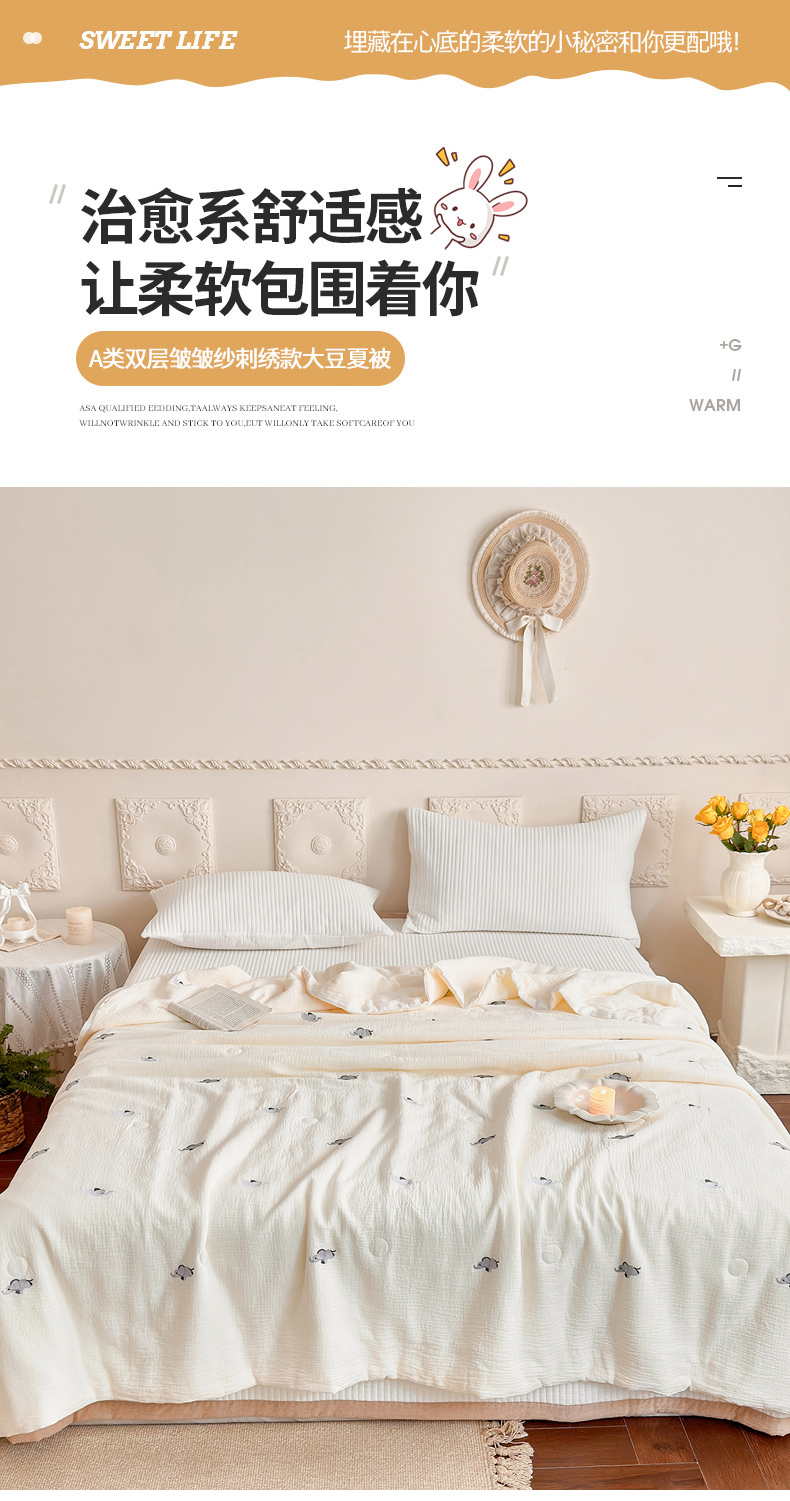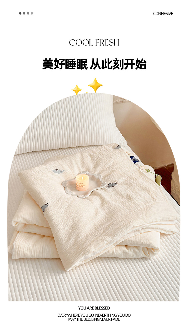 • 91家纺网 家纺一手货源 找家纺 木楌家居 2026新款全棉皱皱纱刺绣款夏被床盖四件套 小飞象